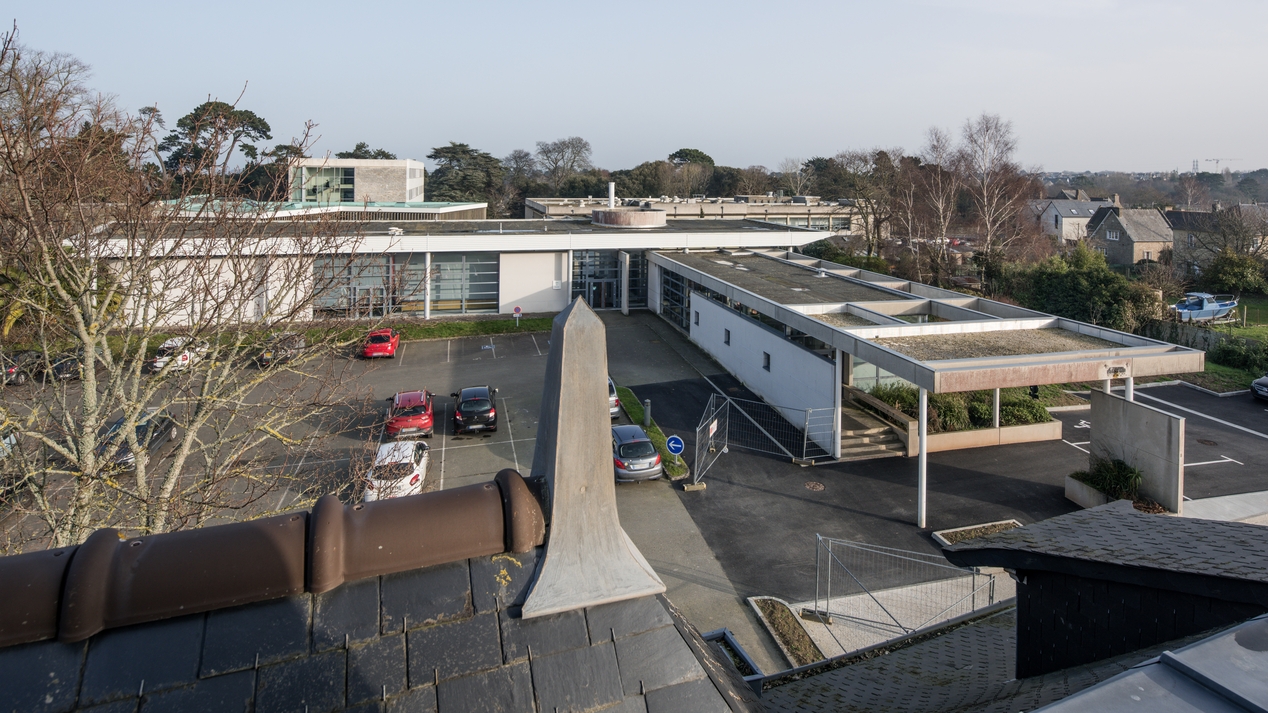 Vue d'ensemble prise depuis un étage de la Villa Surville. Au premier-plan, le restaurant pédagogique et salle des fêtes. Au second-plan, toiture-terrasse du CDI et des ateliers, façade ouest de l'externat.Immatriculation