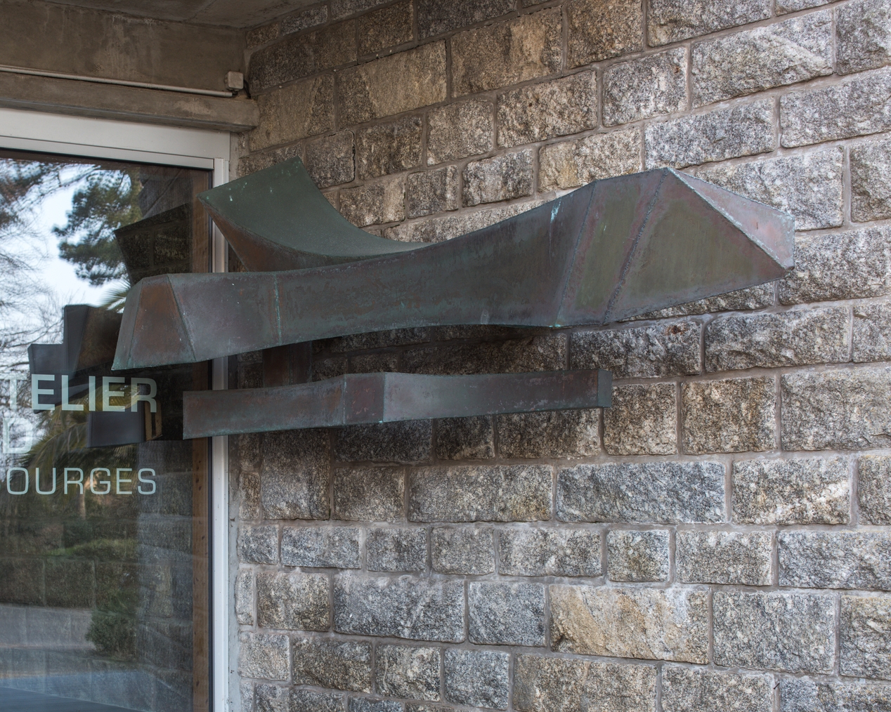 Georges Delahaie, "Voiles et vagues", 1976-1977. Vue prise de l'extérieure : la sculpture se déploie également à l'intérieur, le long du même mur, derrière la vitre.Immatriculation