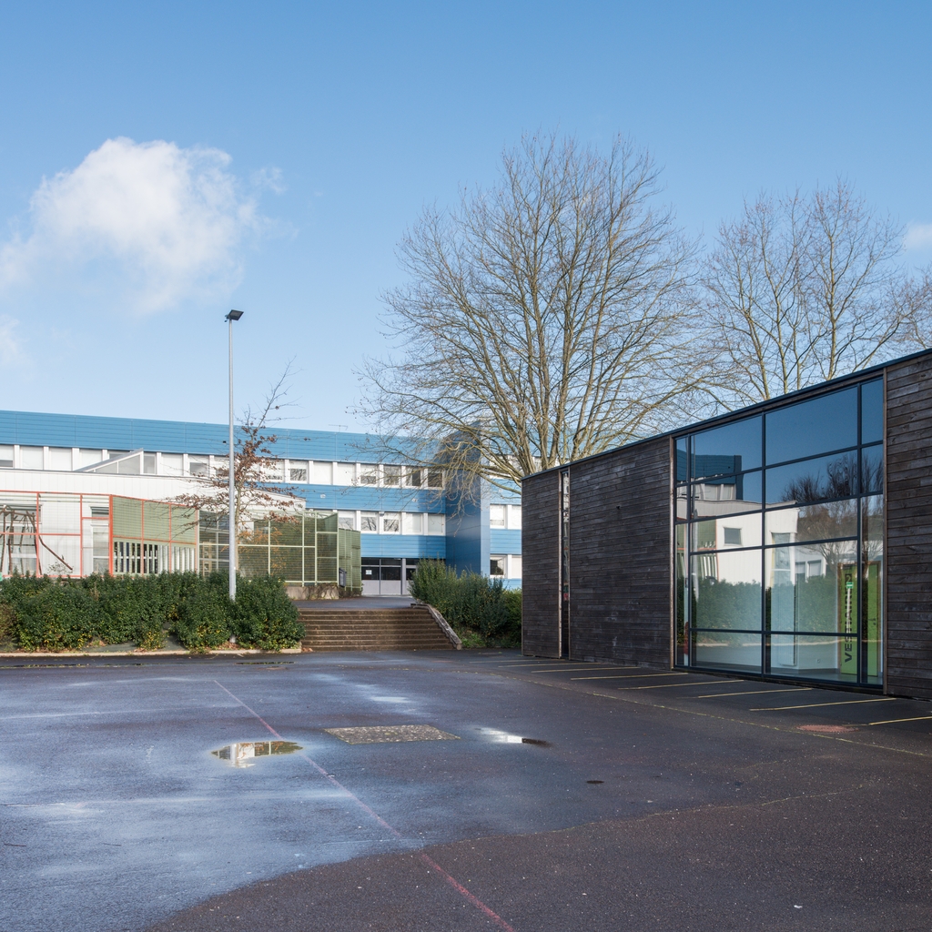 Vue d'ensemble : externat et, à droite, gymnase (Albert Hec et Roger Besnard, architectes, 1966). A gauche, CDI (Bernard Kaleski, architecte, 1992).Immatriculation