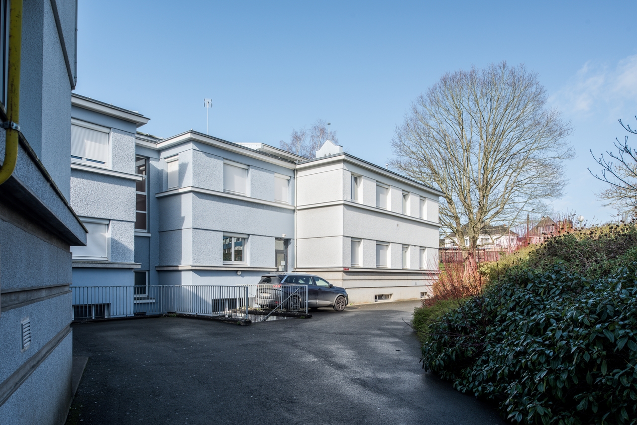Bâtiment C, aile sud, façade arrière (ouest) : extension (Albert Hec et Roger Besnard, architectes, 1966).Immatriculation