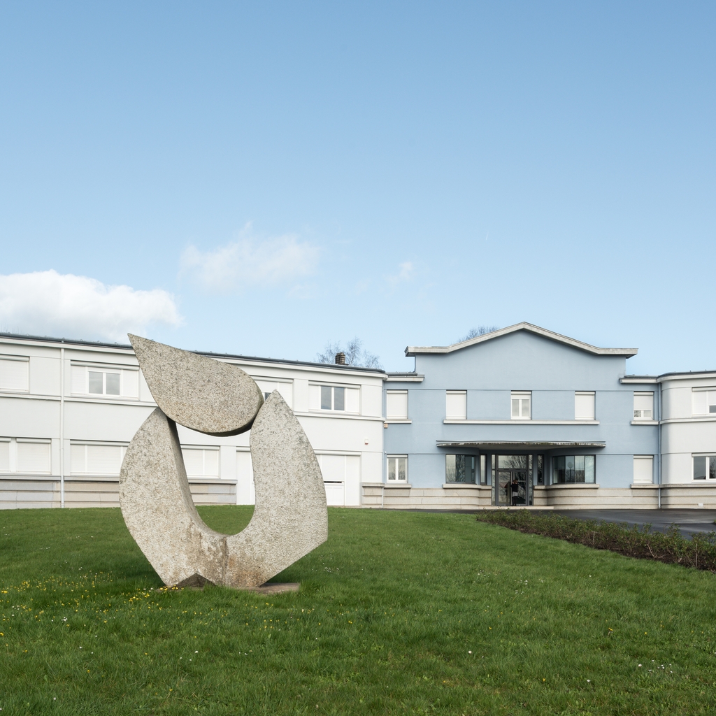 Sculpture de Francis Pellerin. A l'arrière plan, bâtiment C, internat-externat (Albert Hec, architecte).Immatriculation