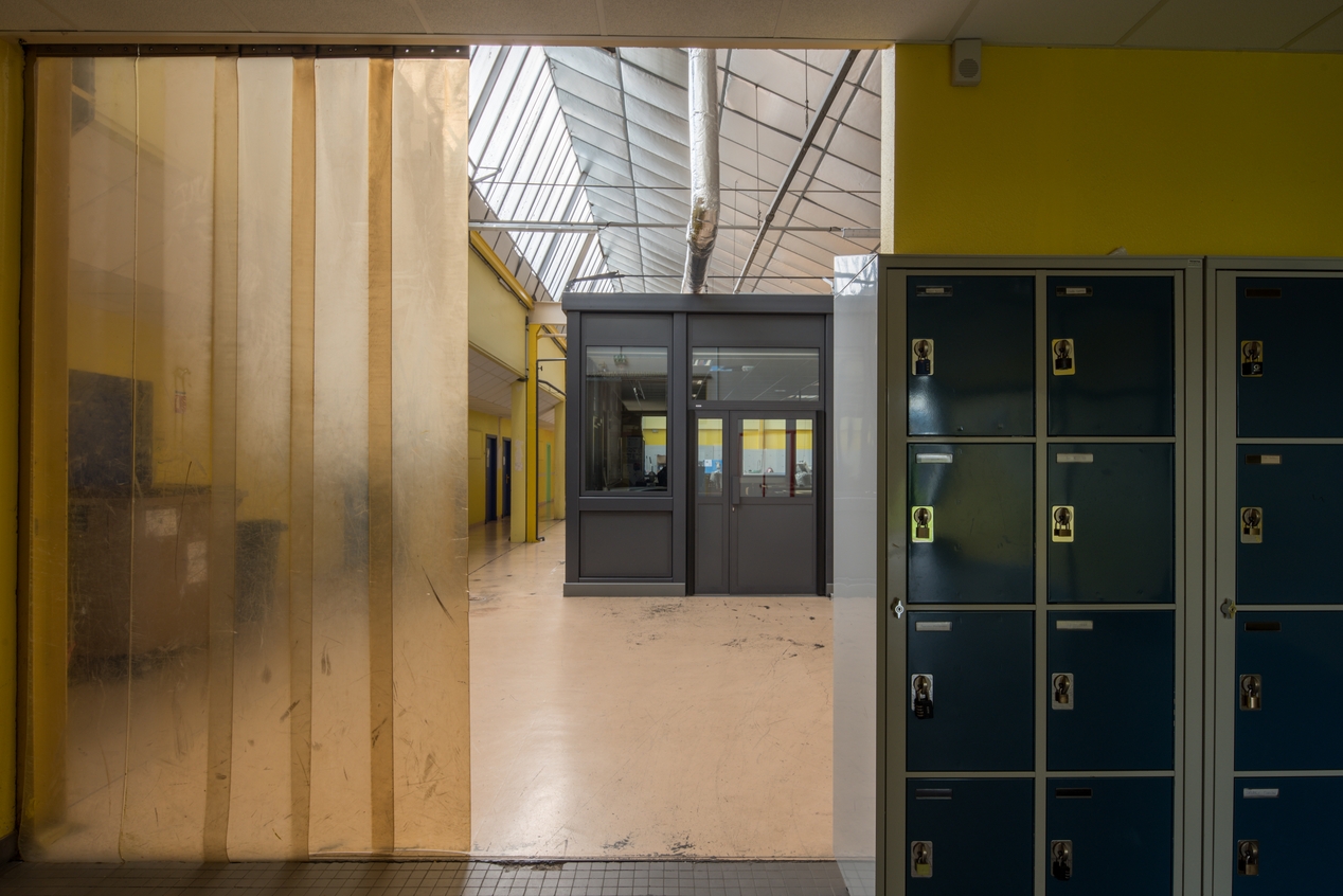 Bâtiment G, accès aux ateliers depuis le dégagement de l'entrée. Albert Hec et Roger Besnard, architectes, 1969.Immatriculation