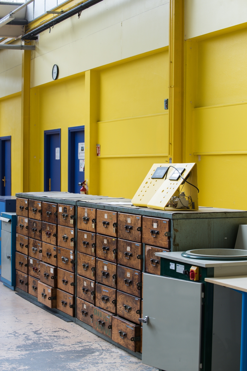 Bâtiment G, ateliers : meuble de rangement à tiroirs en bois.Immatriculation