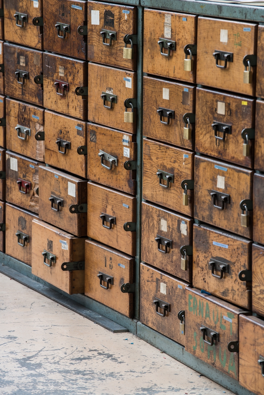 Bâtiment G, ateliers, meuble de rangement à tiroirs : détail.Immatriculation