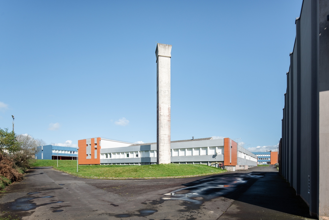 Bâtiment G, ateliers : façade sud-ouest, et cheminée de la chaufferie. Albert Hec et Roger Besnard, architectes, 1969.Immatriculation