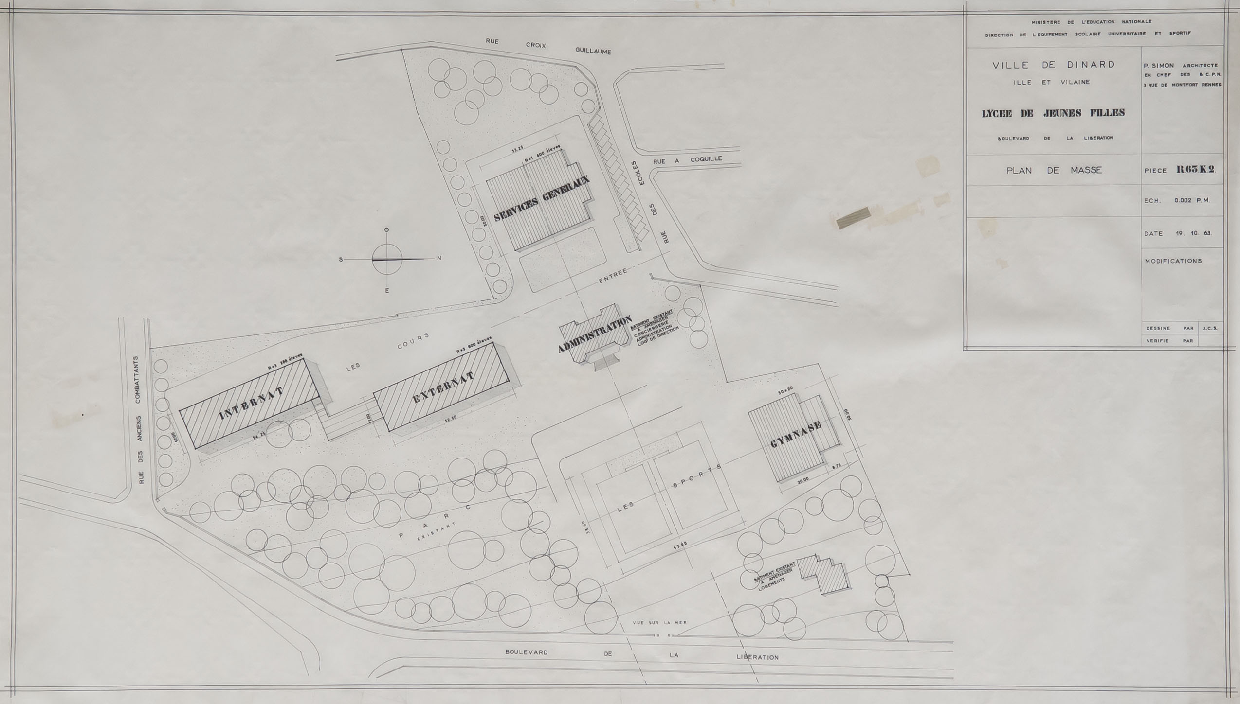 Lycée de jeunes filles. Plan-masse. Patrice Simon, architecte, 19/10/1963.Immatriculation