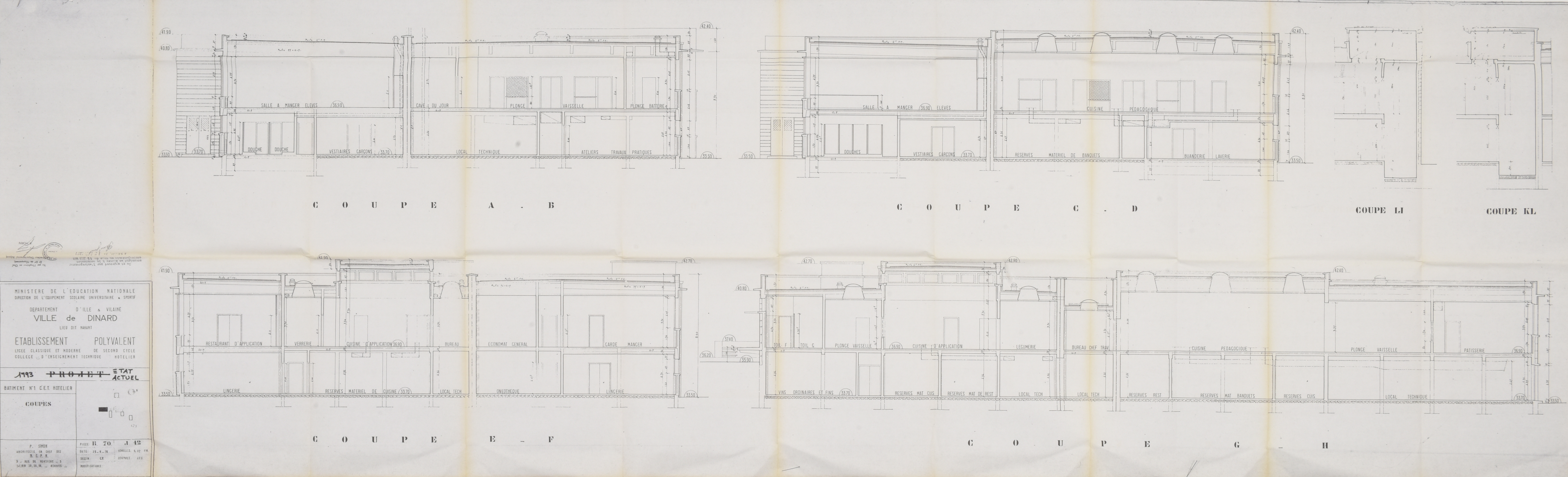 Archives du Conseil régional de Bretagne : 162W142. Simon [P.], Bâtiment n°1 C.E.T. hôtelier : coupes, 1970.