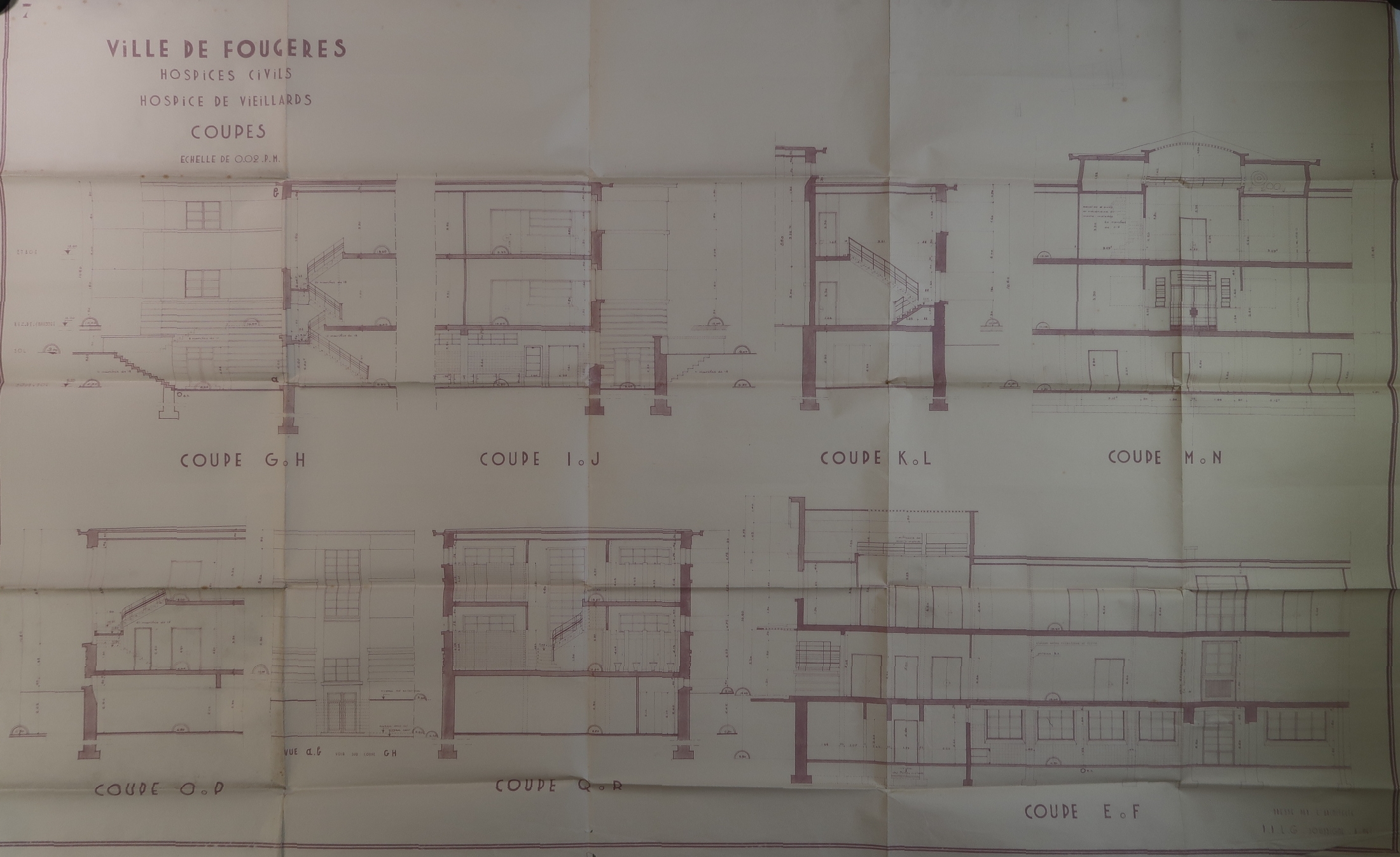 Bâtiment C Internat, ancien hospice de vieillards. Coupes. Albert Hec, architecte, 1936.Immatriculation