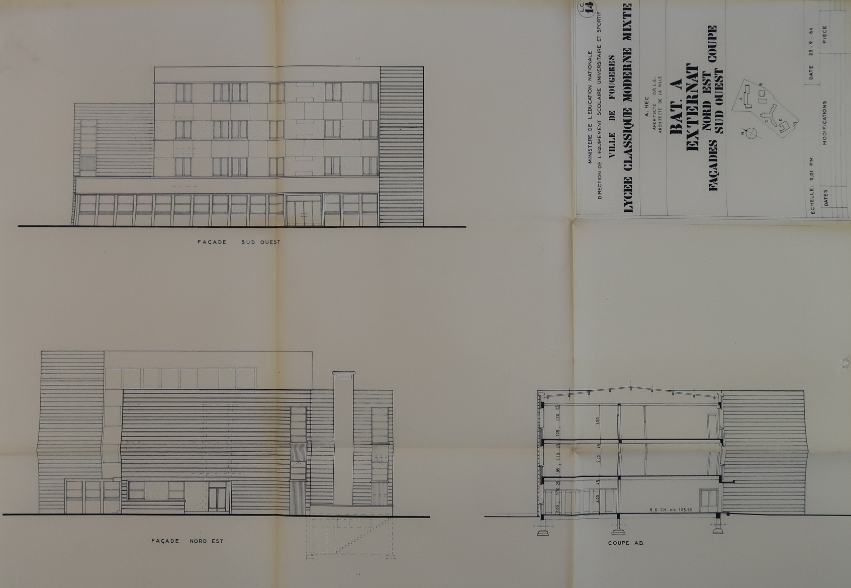 Bâtiment A Externat. Façades nord-ouest sud-est - Coupe. Projet non réalisé tel quel, Albert Hec, architecte, 1964.Immatriculation