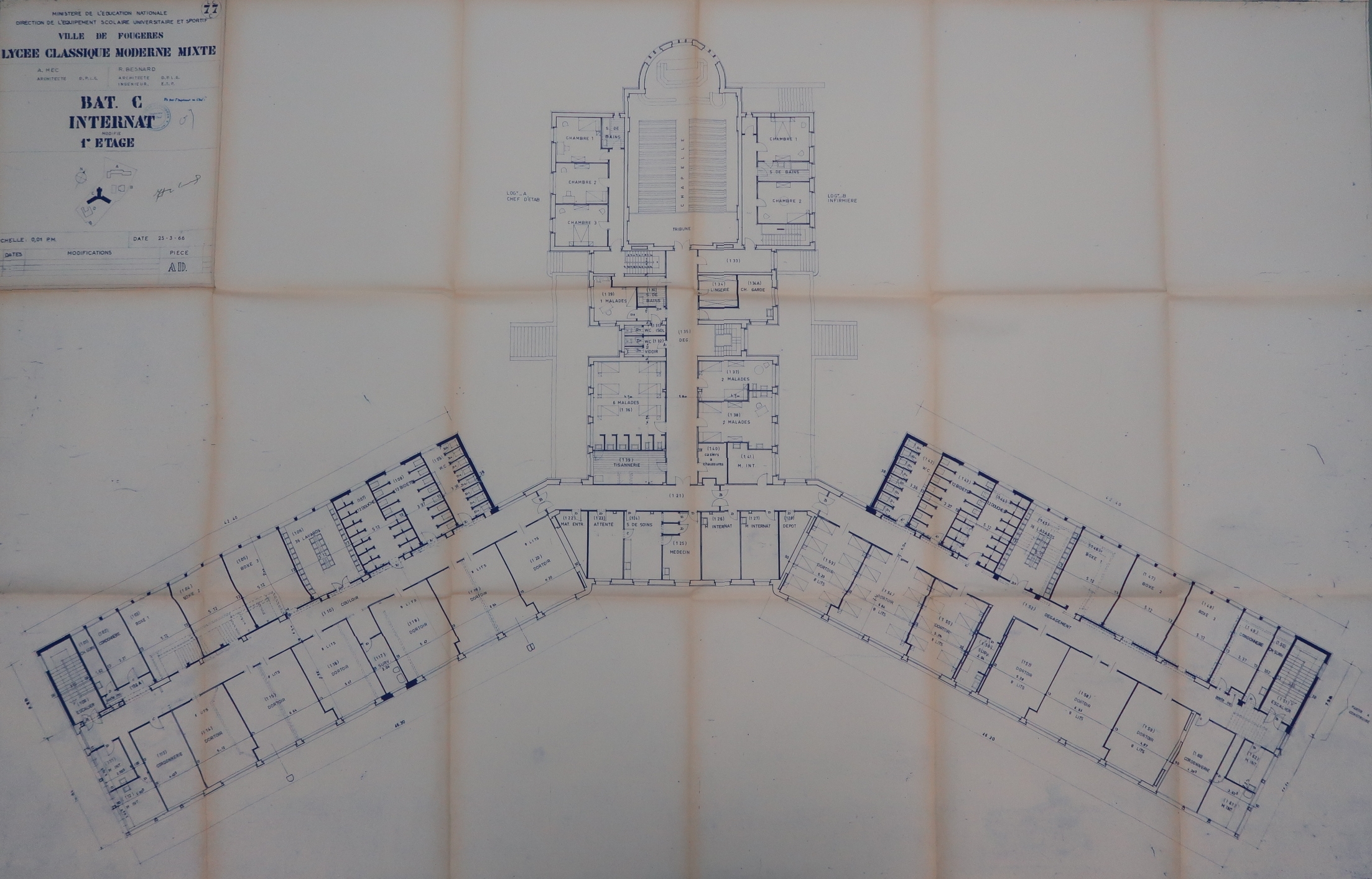 Bâtiment C Internat, plan du 1er étage. Réaménagement en internat du collège municipal, externat, internat et infirmerie, reconstruit après guerre. Noter les extensions des ailes pour satisfaire aux besoins de l'hygiène moderne.Albert Hec et Roger Besnard, architectes, 1966.Immatriculation