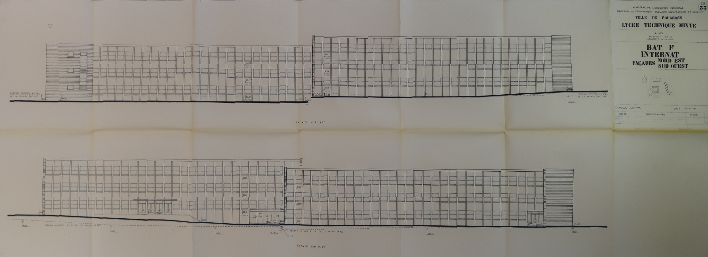 Bâtiment F, Internat. Façades nord-est et sud-ouest. Albert Hec, architecte. 1964.Immatriculation