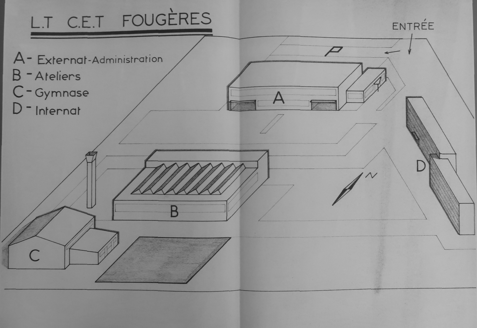Archives départementales d'Ille-et-Vilaine : 1080 W 88. Axonométrie du lycée technique et CET de Fougères, vers 1964-1969.