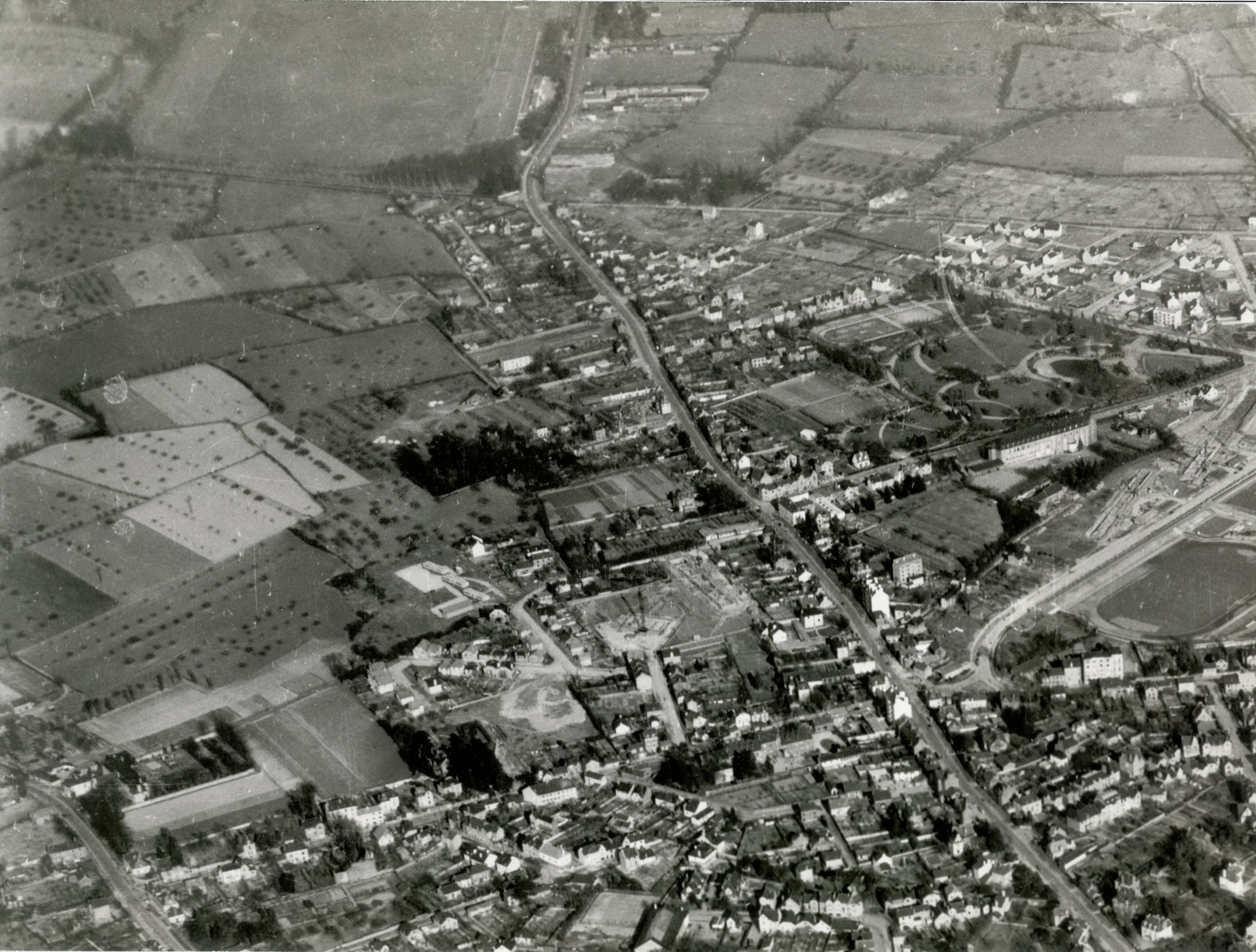 Vue aérienne du nord-est de Rennes, la rue de Fougères et la campagne.Immatriculation