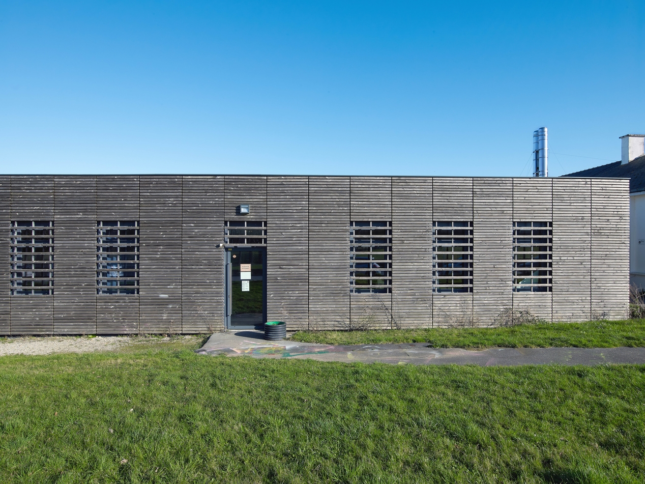Détail de la façade ouest le l'extension des ateliers. Le bardage en bois lui donne un caractère très contemporain (Lionel Dunet architecte, 2008-2012).Immatriculation