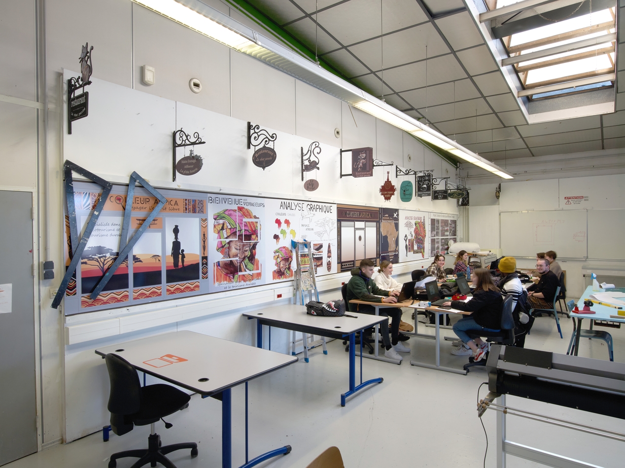 Salle pour la formation signalétique, enseigne et décor. Noter l'éclairage naturel zénithal et les enseignes commerciales exposées au mur.Immatriculation