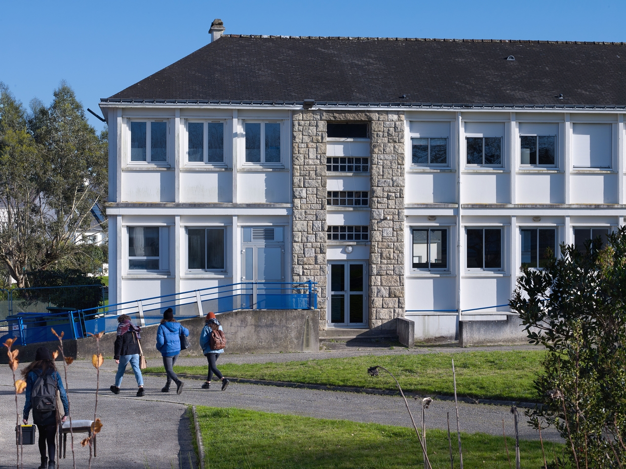 Façade ouest du bâtiment des services communs de l'internat, prise depuis la cour (Yves Guillou architecte, 1962).Immatriculation