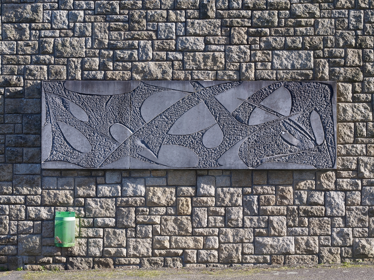 "L'envol", bas-relief en "petit granit belge" du sculpteur Yves Bonnard (1963-1964).Immatriculation
