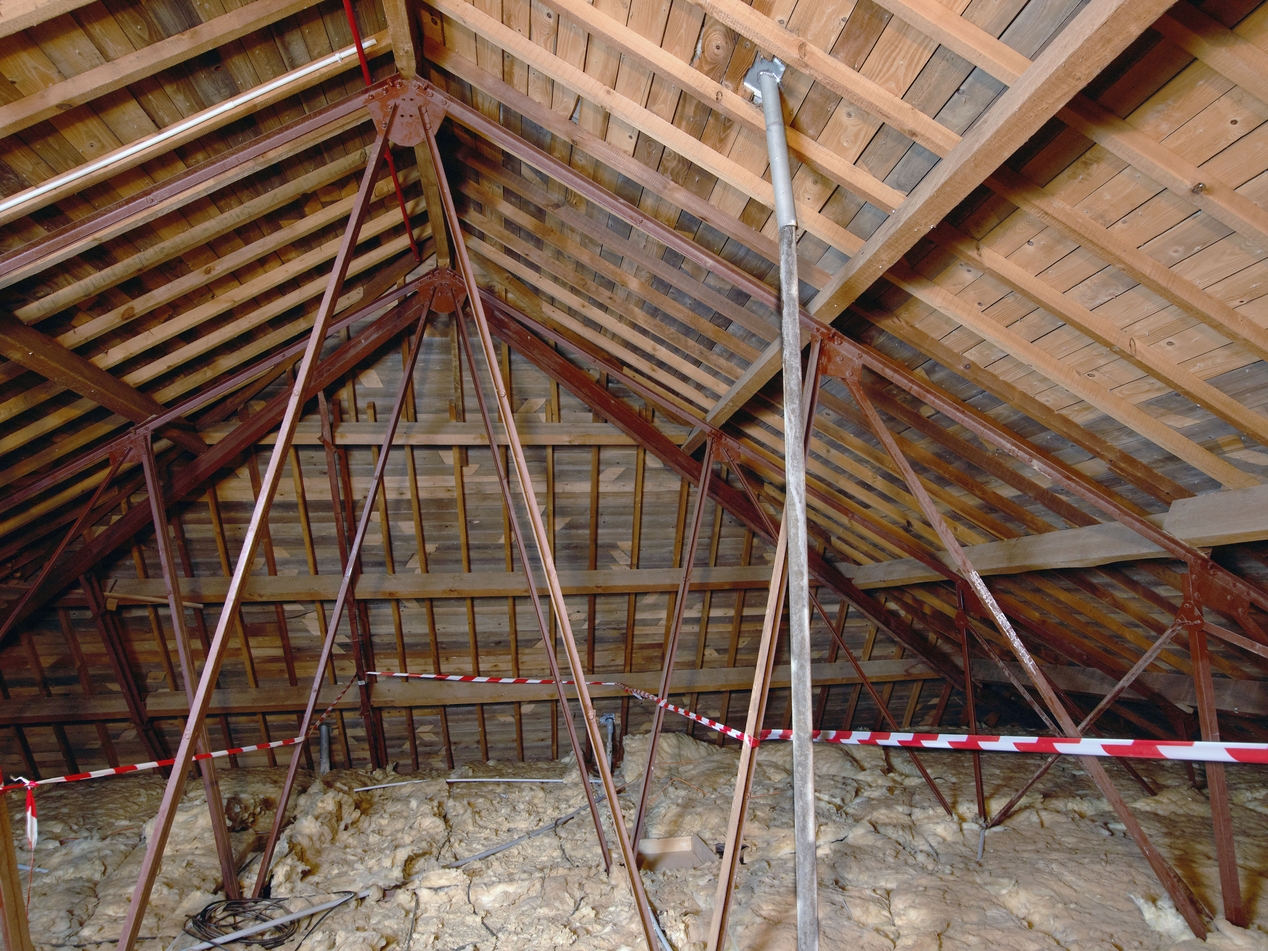Charpente de l'internat (Yves Guillou, architecte, 1962) : charpente métallique en treillis de cornières. Noter la mixité des matériaux : métal pour les fermes et arbalétriers, bois pour les pannes et chevrons. Un témoignage de la préfabrication.Immatriculation