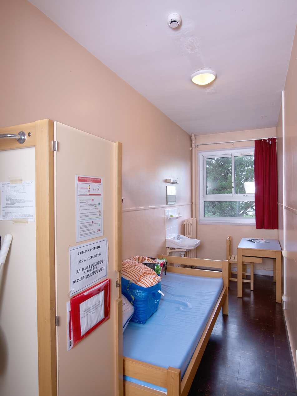 Chambre d'un surveillant d'internat, occupant la largeur d'une seule trame. Noter le lavabo individuel.Immatriculation