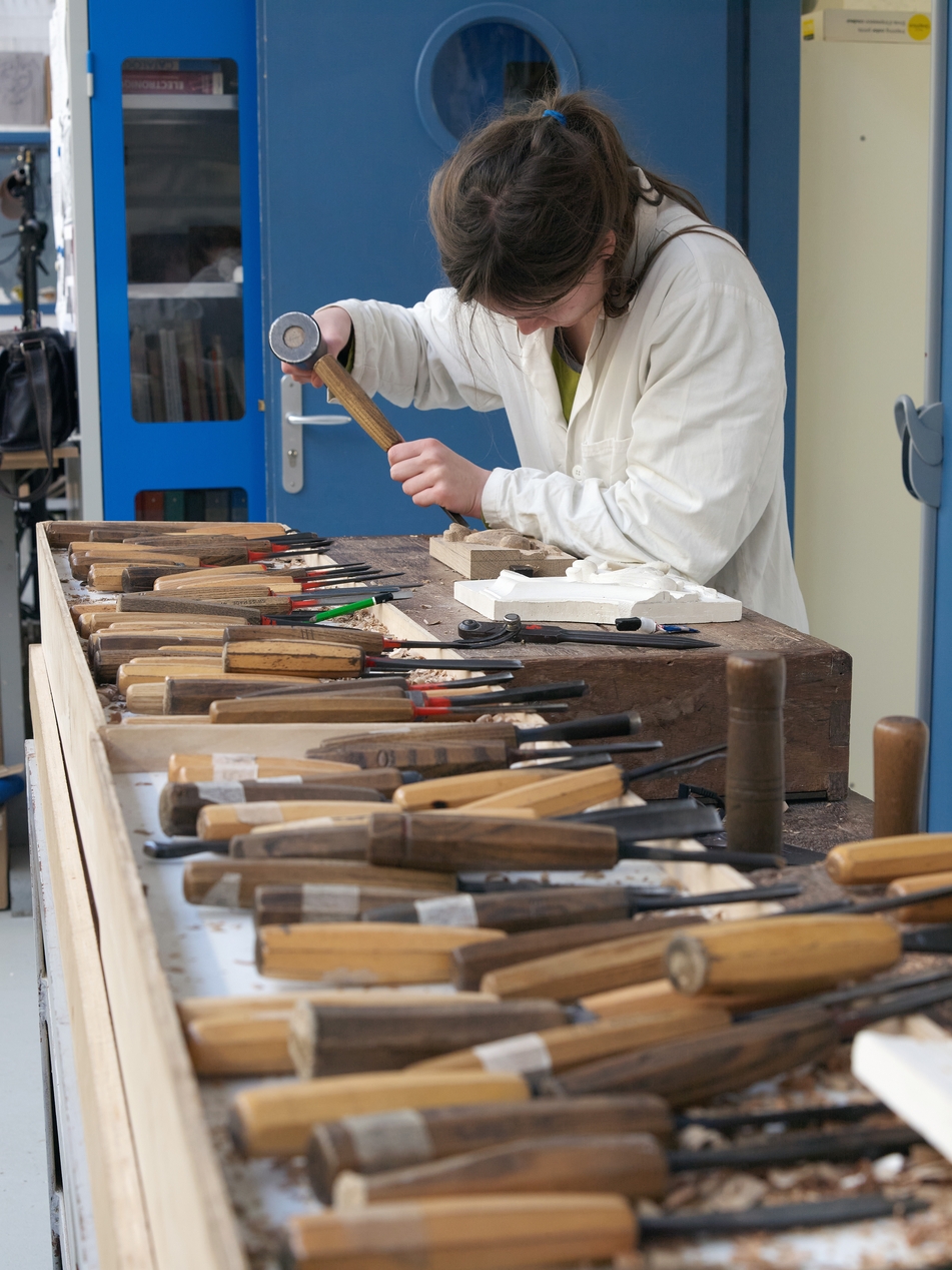 Atelier sculpture. Noter la multitude de ciseaux à bois.Immatriculation