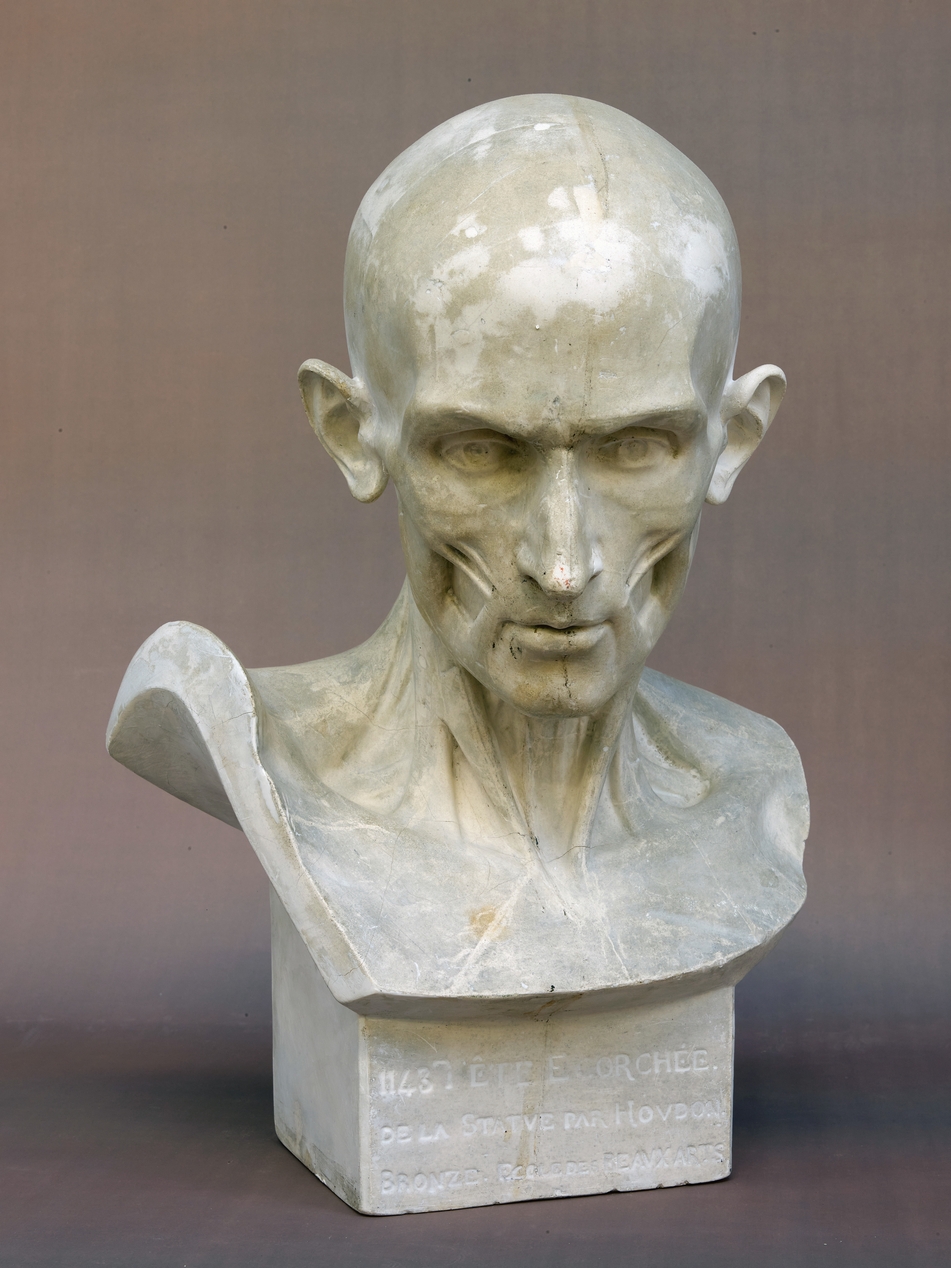 Tête de l'Ecorché, bras droit replié au-dessus de la tête. Houdon, 1792 (citation). Conservé à l'École nationale supérieure des Beaux Arts de Paris. (cat. vente n°1143)Immatriculation