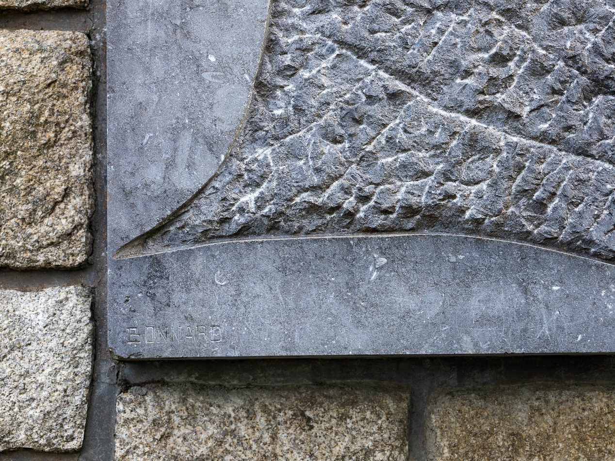 "L'envol", bas-relief en "petit granit belge" du sculpteur Yves Bonnard (1963-1964) : détail sur la signature.Immatriculation