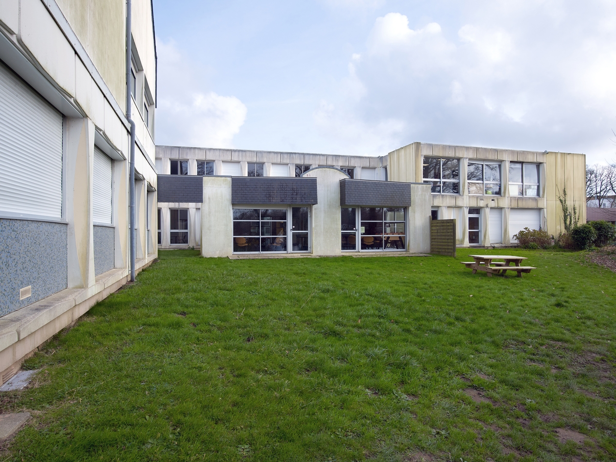 Vue prise le long de la façade de l'externat surélevé (A3), façade de l'espace professeurs (extension) et de l'administration (à droite).Immatriculation