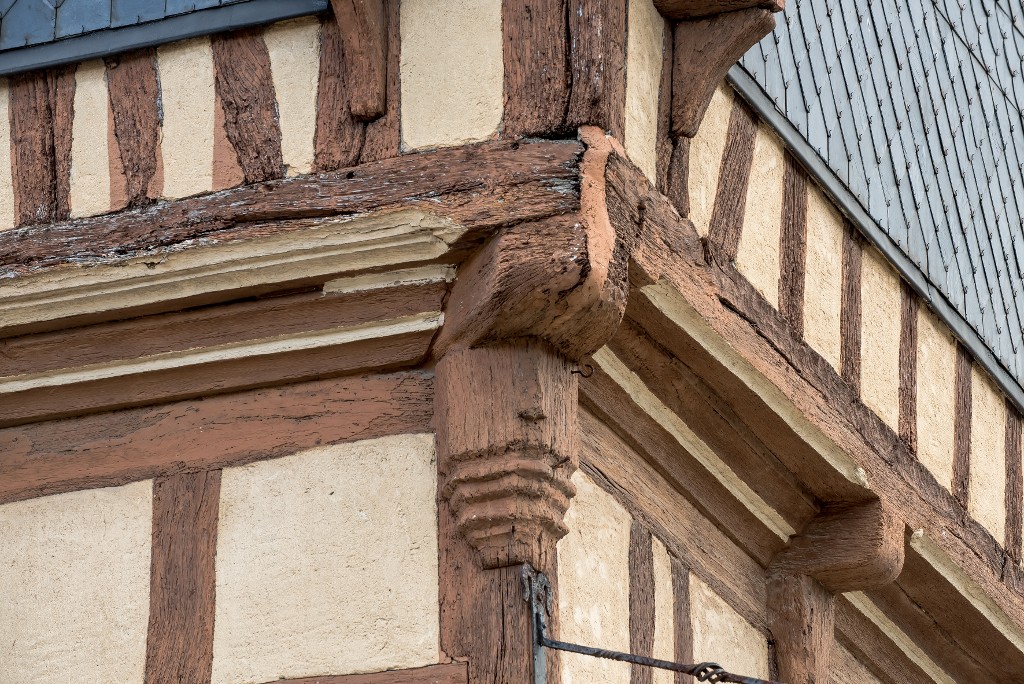 Poteau cornier à l'étage, soutenant la poutre d'enrayure.Immatriculation