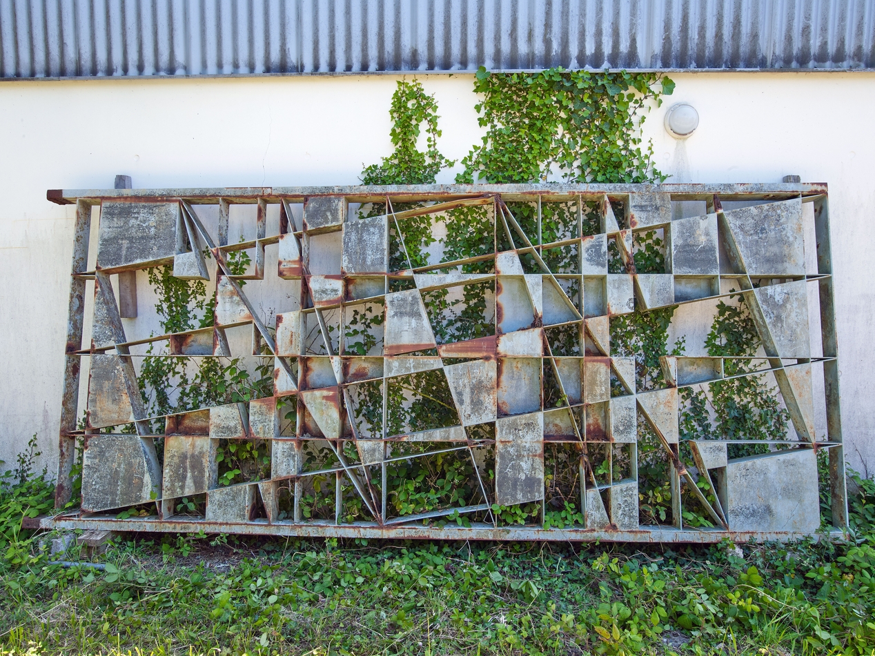 Francis Pellerin : "Grille verticale". Sculpture en métal, vers 1963-1964. Vue prise en 2020, alors que la sculpture, rouillée, a été déposée pour des raisons de sécurité.Immatriculation
