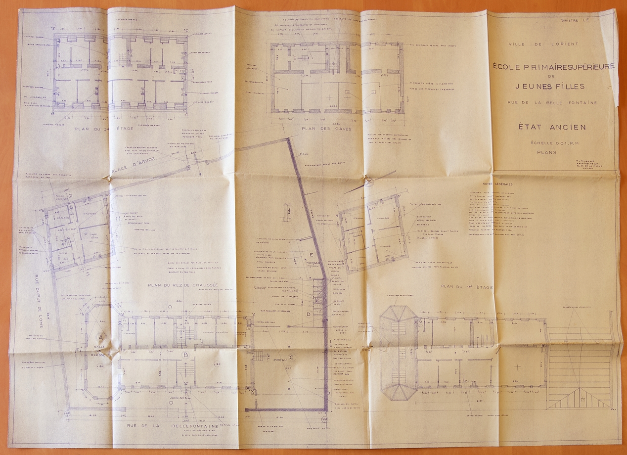 Plans de l'école primaire supérieure de jeunes filles de Lorient, détruite pendant la Seconde Guerre mondiale, dressés par l'architecte R. Grihaigne, afin de chiffrer les dommages de guerre.Immatriculation