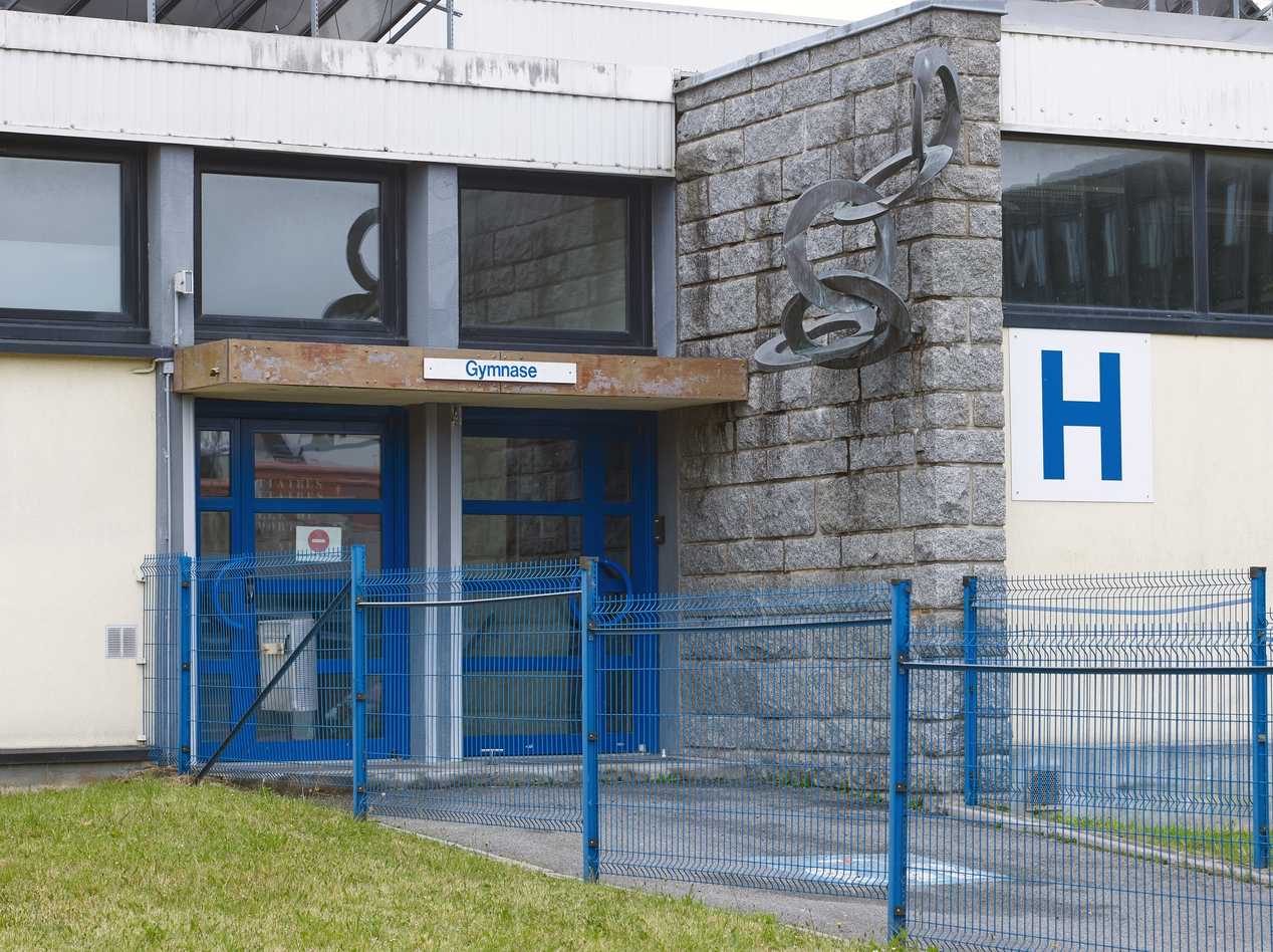 Roger Joncourt, sculpture représentant les 5 anneaux olympiques, dans un mouvement dynamique. Elle est en laiton mis en forme, soudé et patinée. 1974. Vue de situation, sur la façade, à droite de l'entrée du gymnase (René Ouvré architecte, 1963).Immatriculation