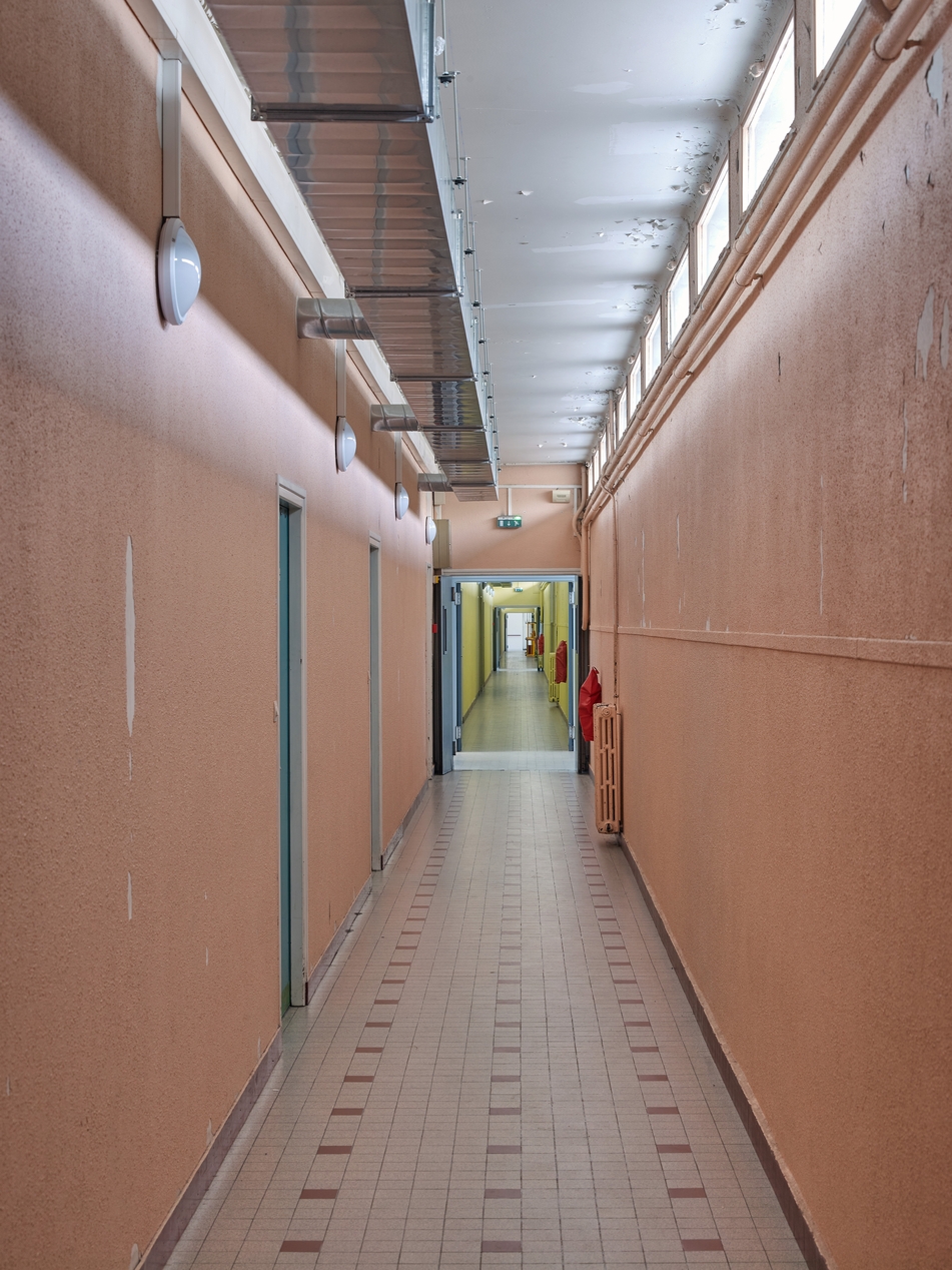 Bâtiment B, externat : couloir de circulation latéral, au nord-ouest de la longue barre. Noter le bandeau de fenêtres hautes (au premier étage, le couloir est attenant aux ateliers) et les carreaux de grès au sol.Immatriculation