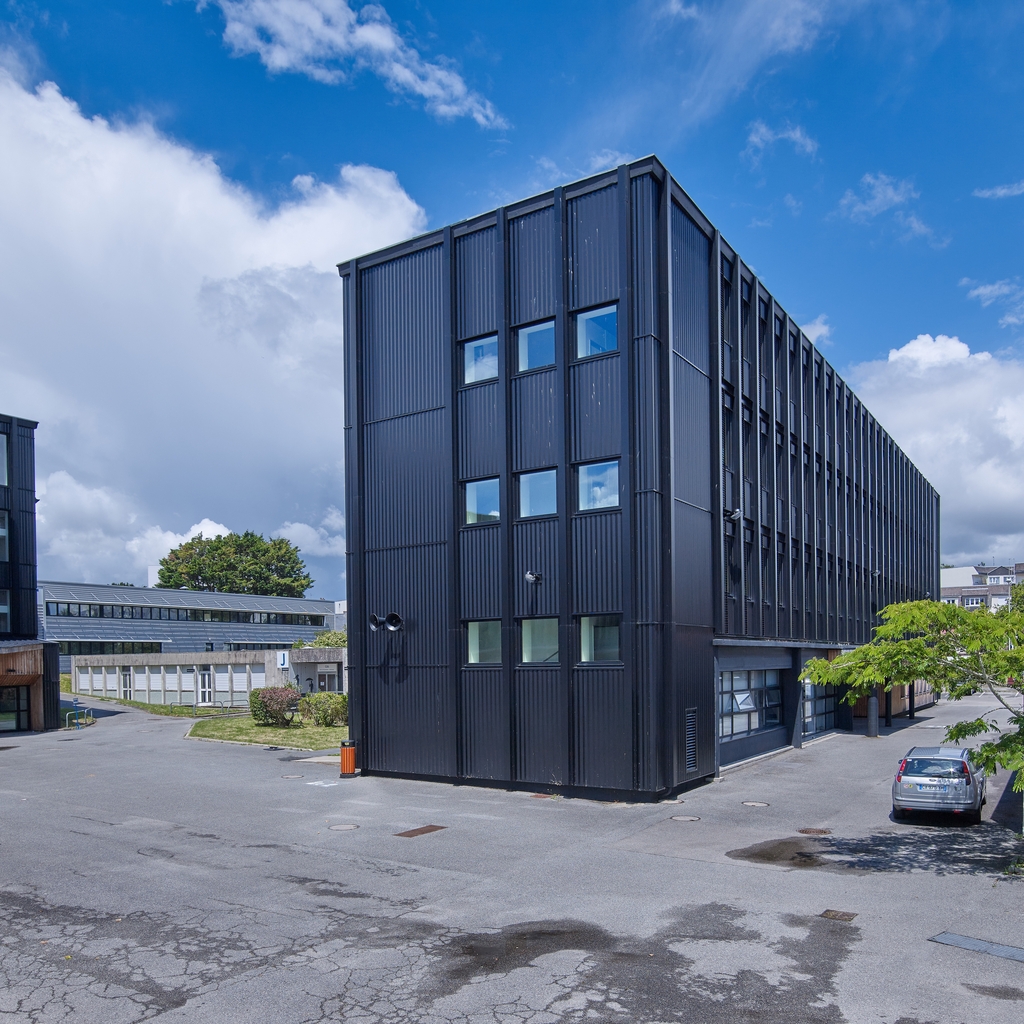 Façade sud-ouest du CDI (Félix Le Saint et Jacques Olivier, architectes, 1974) et bâtiment C (Georges Tourry, architecte, 1959, réhabilitation Anthracite architecture, 2016).Immatriculation
