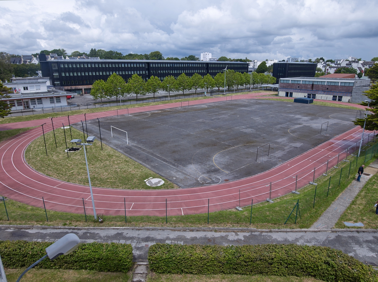 Vue d'ensemble : plateau d'évolution, piste, aire de lancer du disque, gymnase et, à l'arrière plan, bâtiment de la restauration scolaire (partiel) et vue d'ensemble des externats B et C.Immatriculation