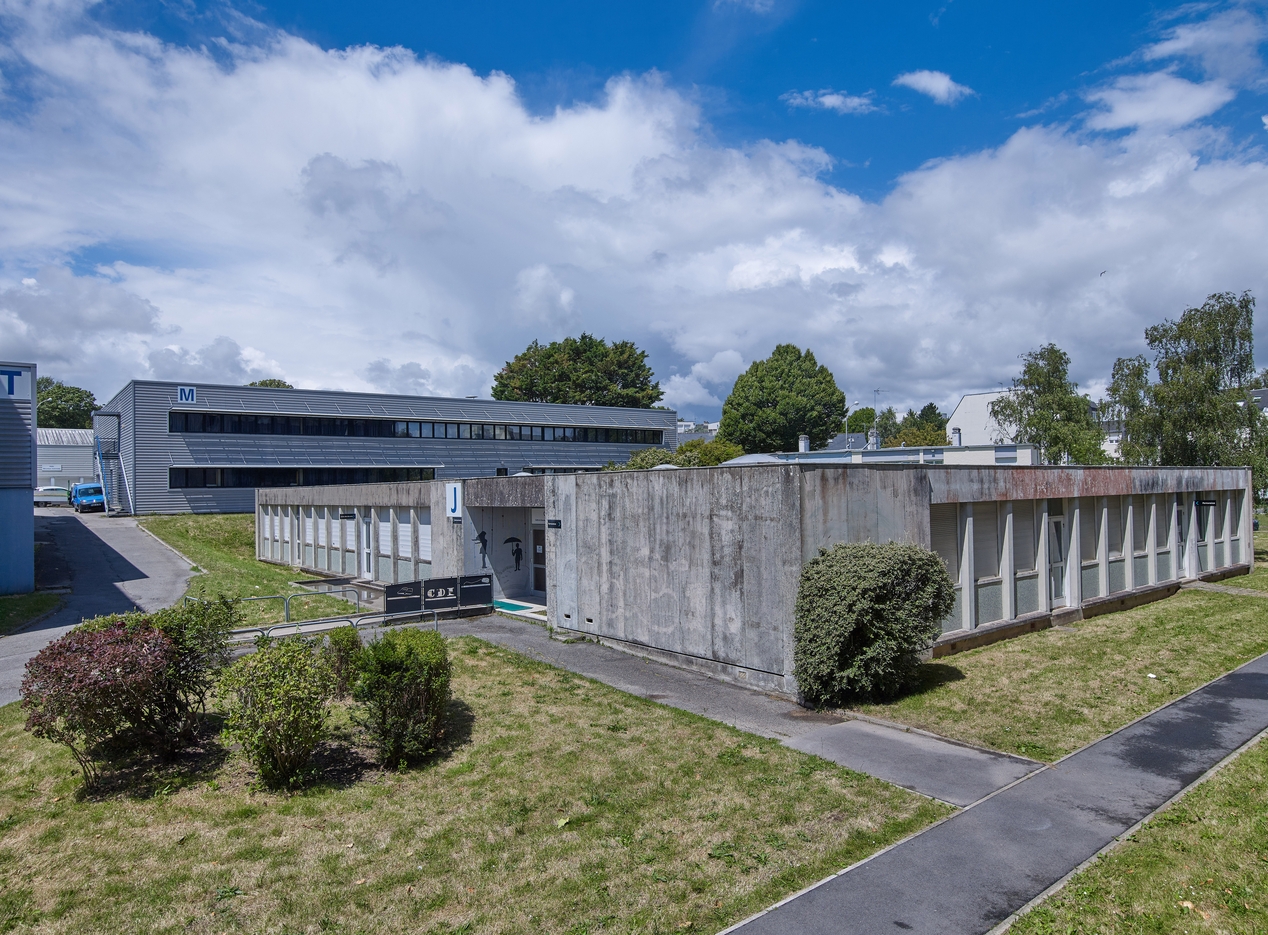 CDI, vue d'ensemble prise du sud ((Félix Le Saint et Jacques Olivier, architectes, 1974). A l'arrière plan, bâtiment M, atelier mécanique et carrosserie.Immatriculation