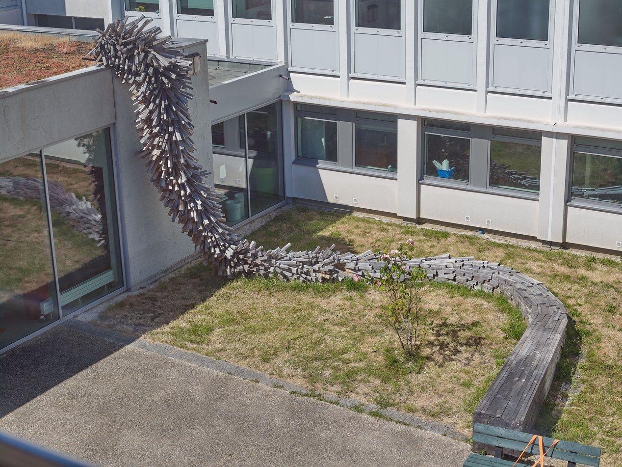 "Hérisse", une sculpture en bois de Simon Augade, 2018. Partie de la sculpture côté cour.Immatriculation