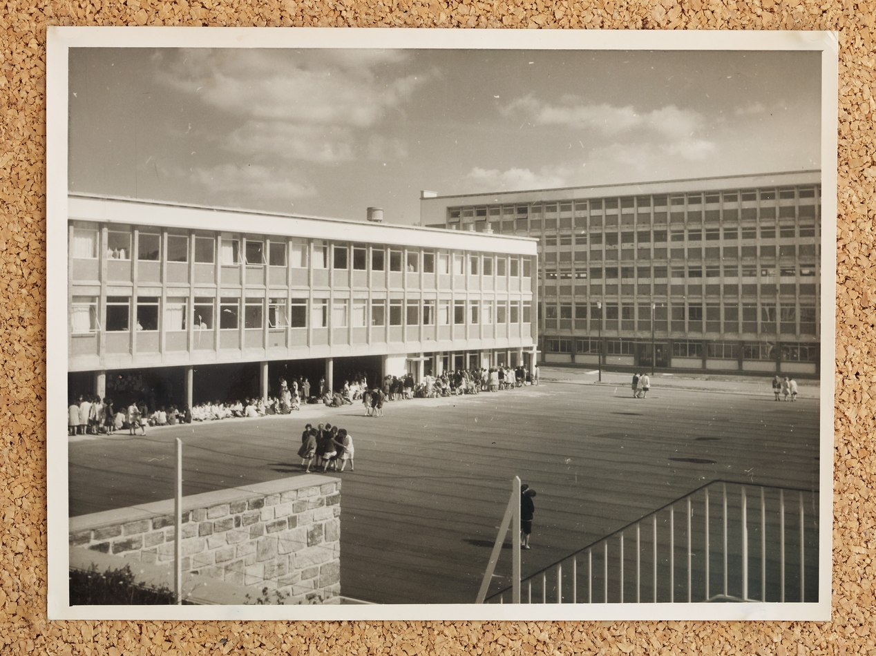 Bâtiment B et C. Élèves dans la cour et sous le préau.Immatriculation