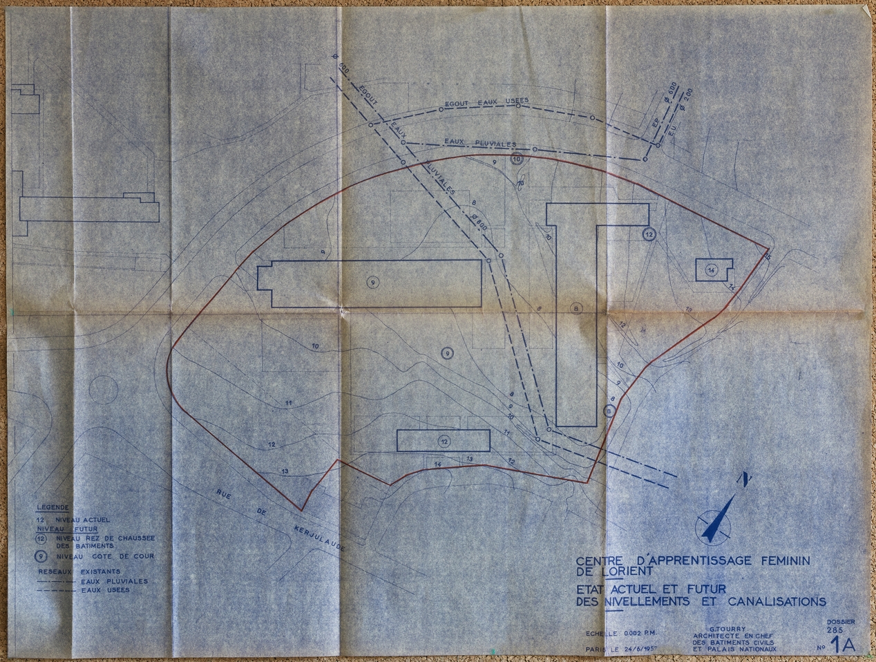 Centre d'apprentissage féminin de Lorient. Etat actuel et futur des nivellements et canalisations. G. Tourry, 24/6/1957.Immatriculation