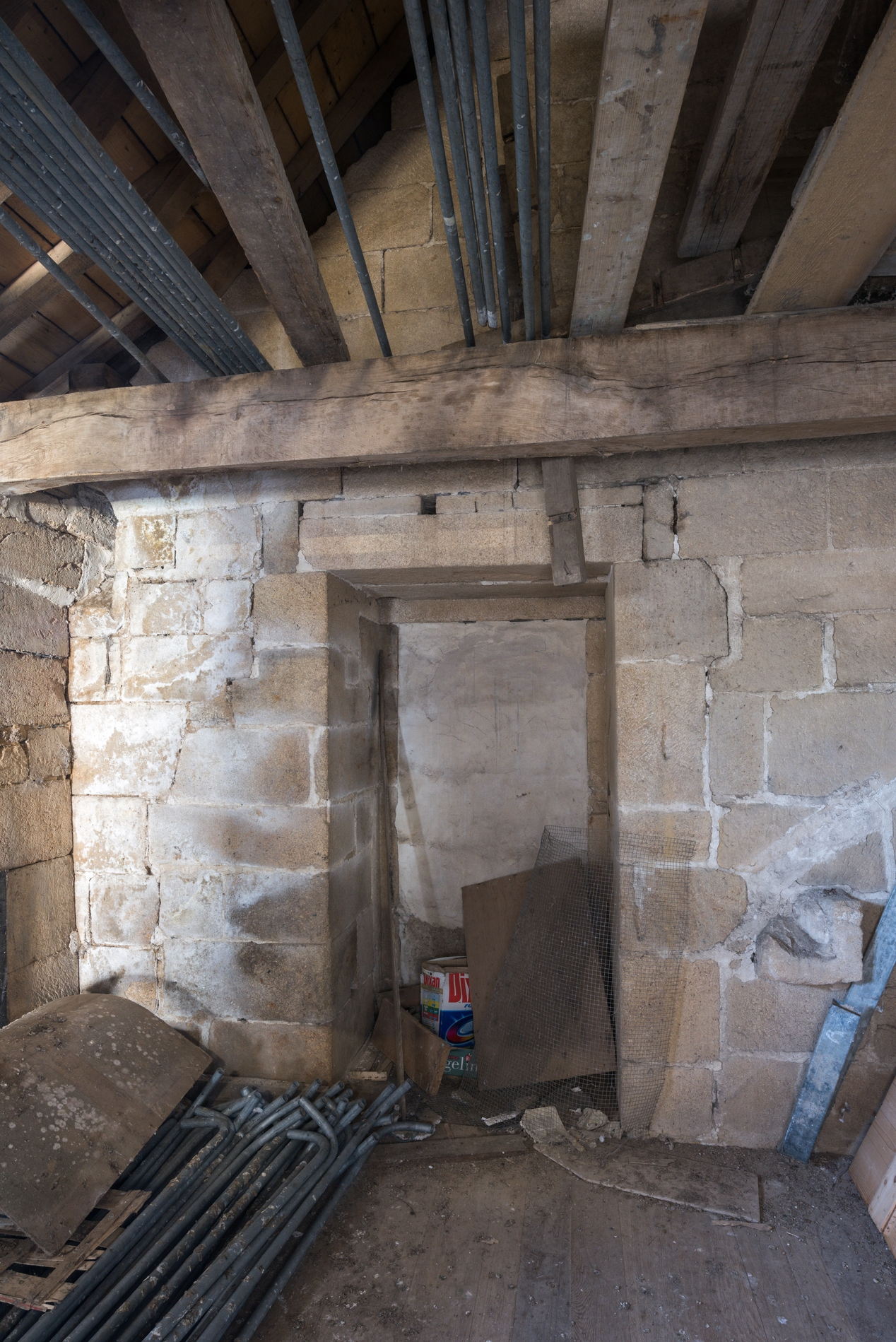 Vue de détail : baie obturée dans le mur est et à l'étage du bâtiment dit de la "prison" (probable ancienne salle du conseil de fabrique).Immatriculation