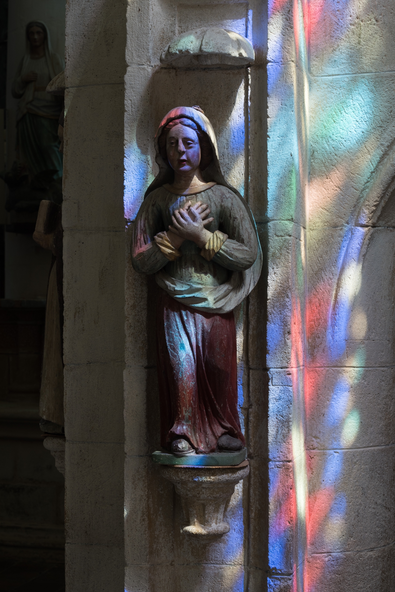 Vue de détail : statue de la Vierge dans son dispositif de présentation intégré à l'architecture de la tribune seigneuriale.Immatriculation
