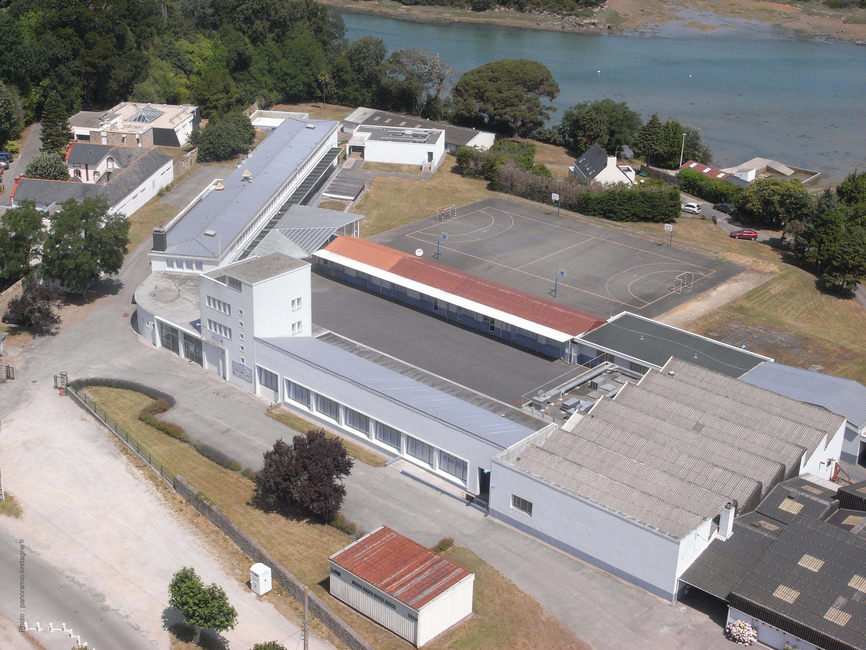 Vue aérienne oblique d'ensemble (2010), prise depuis le sud : à l'arrière plan, la rivière du Sac'h, dans laquelle le lycée a installé des tables ostréicoles.Immatriculation