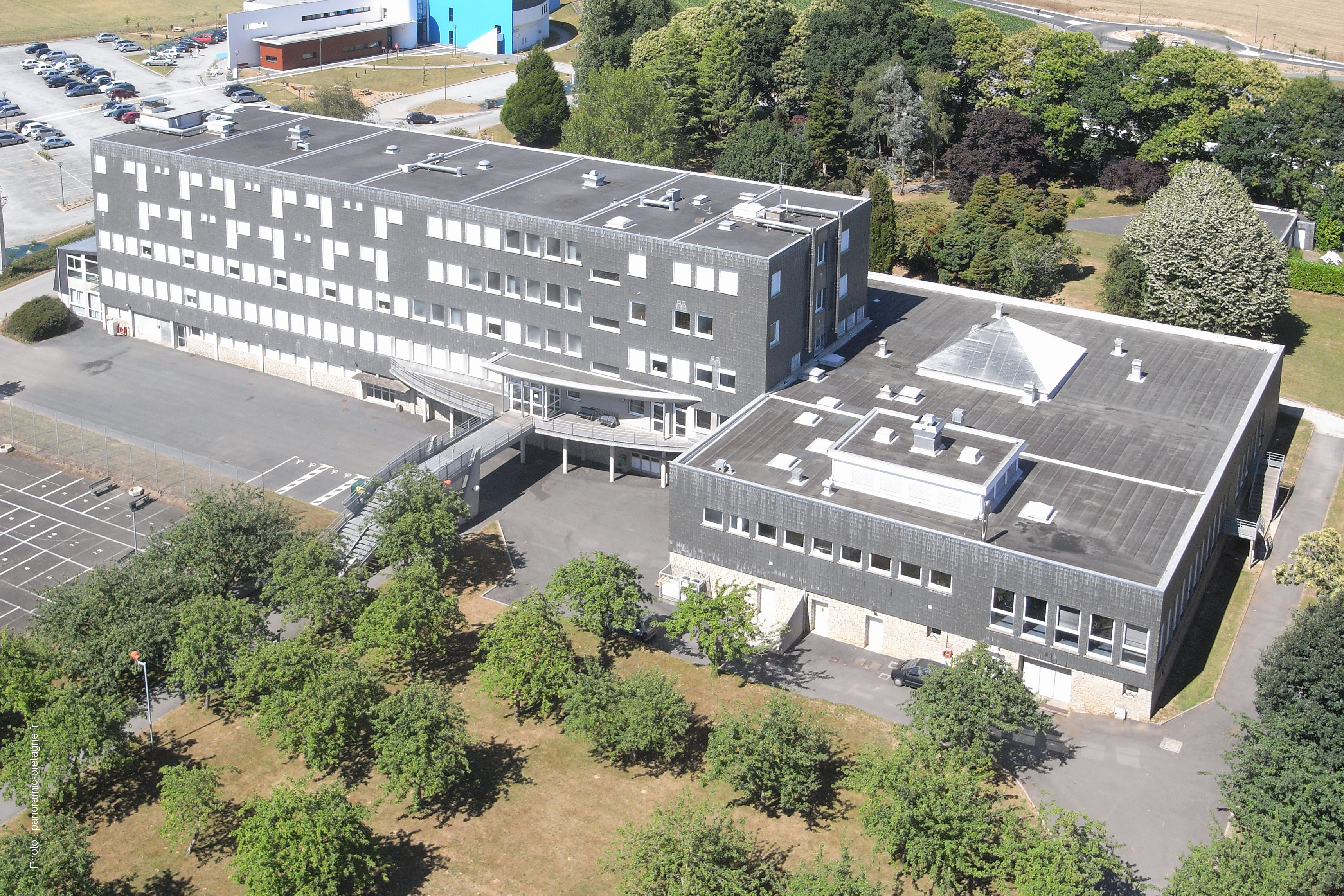 Vue aérienne oblique prise du sud Les bâtiments des actuels internats, service de restauration et infirmerie (anciennement collège agricole de jeunes filles).Immatriculation