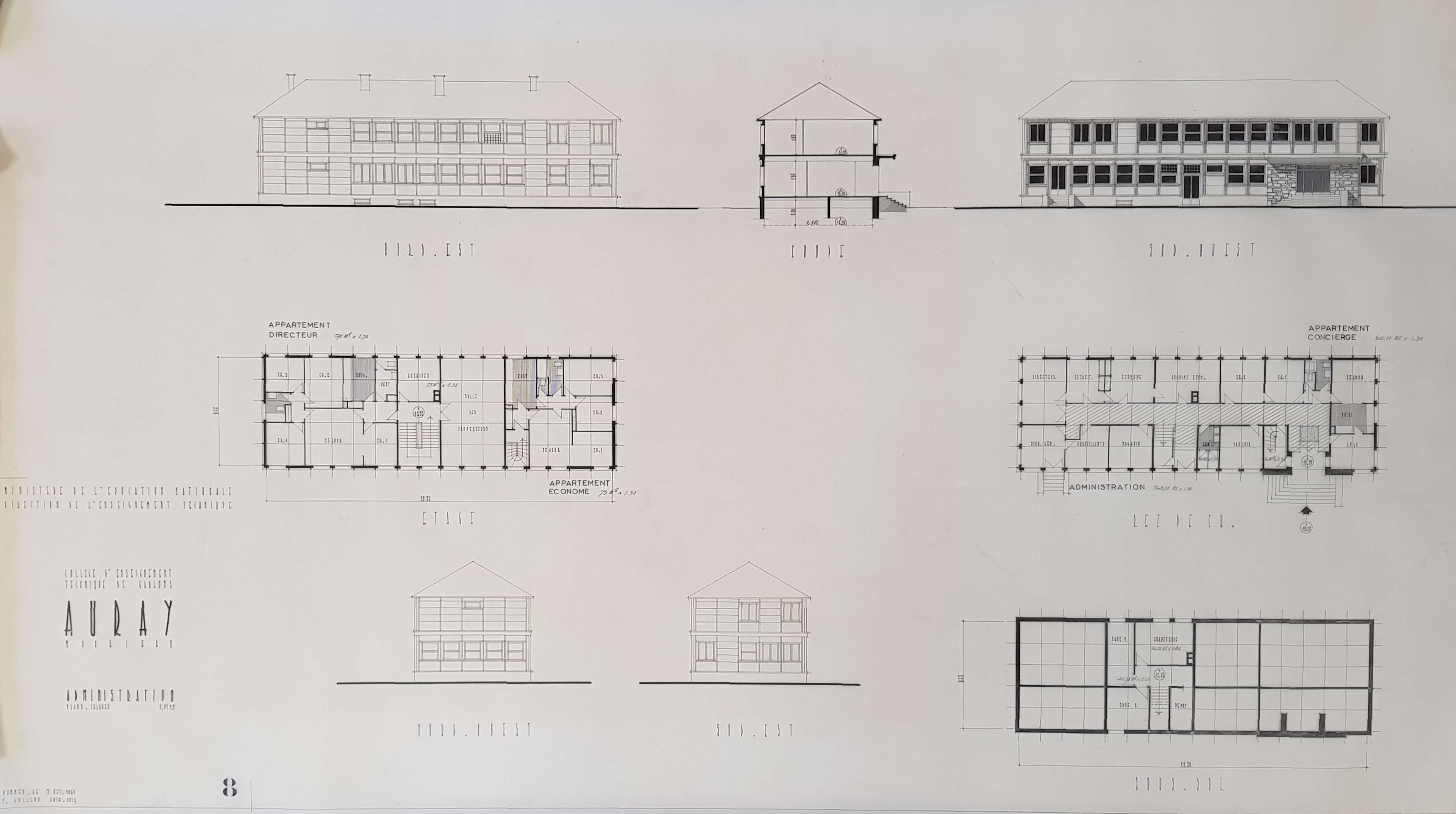 Plans et élévations de l'administration (Yves Guillou architecte, 1961). Le plan en bas à droite montre que ce bâtiment-là, aussi, est composé sur une trame de 1,75 m.Immatriculation