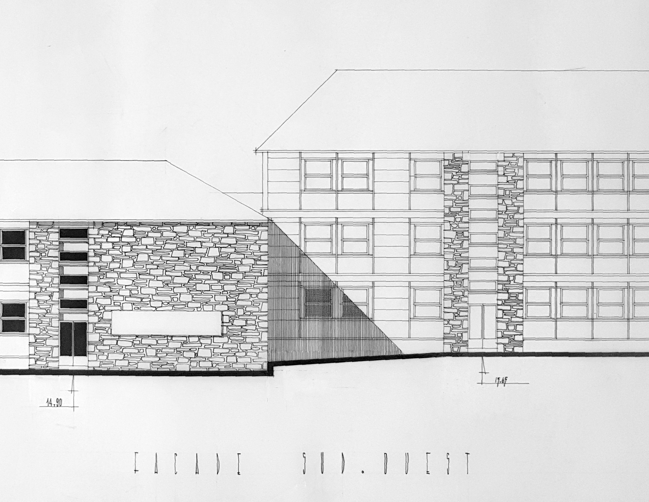 Élévations et coupes de l'internat, façades sud-ouest, détail. Yves Guillou architecte, 1961. Noter l'emplacement réservé à l’œuvre du 1% artistique et le parement en pierre des part et d'autres des entrées, dont les travées se singularisent de celles, répétitives, des chambres.Immatriculation