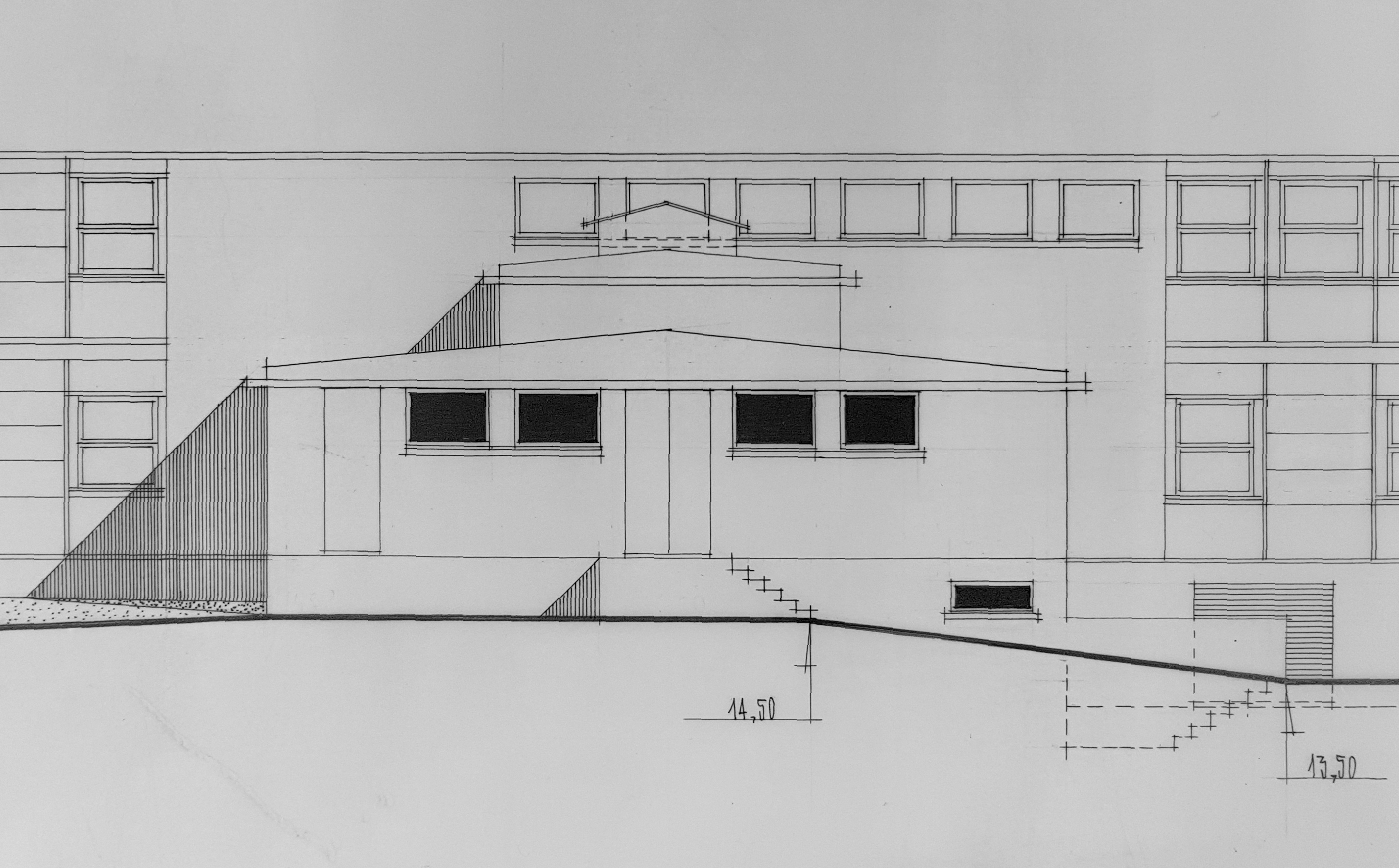 Élévation de la façade nord-est de l'internat. Yves Guillou, architecte, 1961 : détail sur la façade arrière des cuisines.Immatriculation
