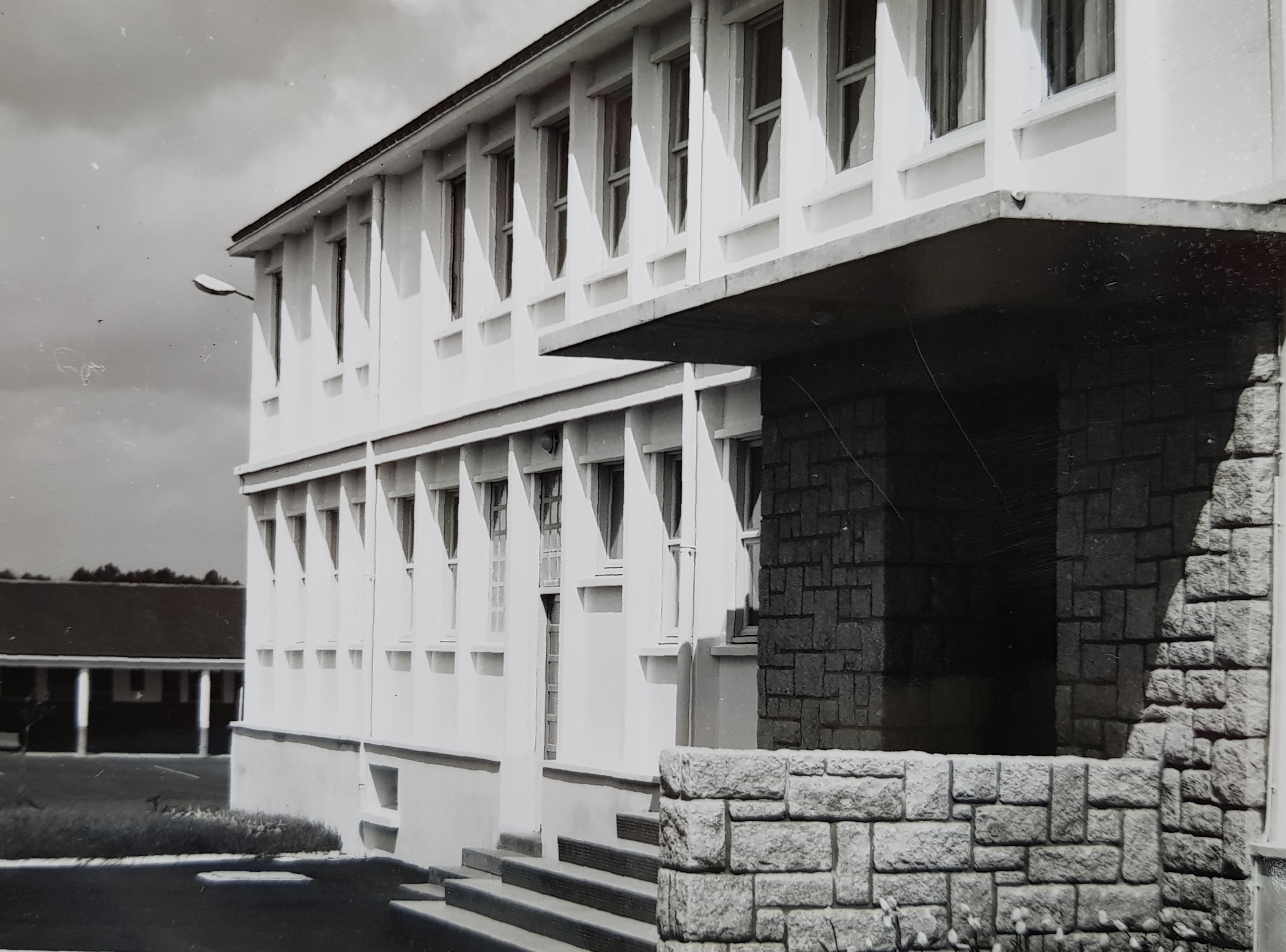 Façade de l'administration. Au premier plan, détail sur l'entrée : le photographe cherche à valoriser un des éléments plus "dessiné" de l'architecture (Yves Guillou architecte, photo ca. 1963).Immatriculation