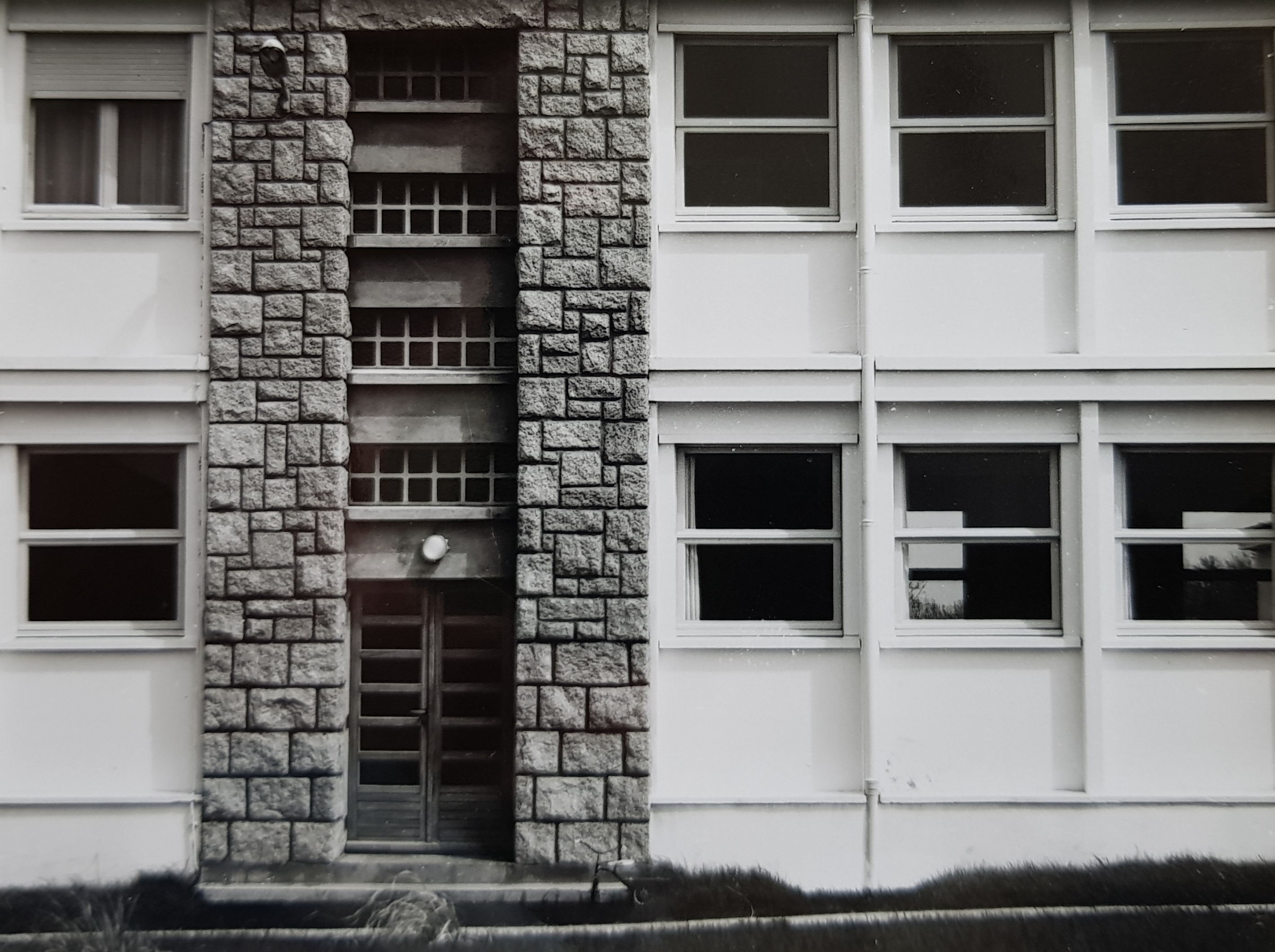 Détail sur une entrée de l'internat, mettant en valeur le parti architectural : parement de granite soigneusement appareillé, blocs de pavés de verre horizontaux et superposés pour éclairer la cage d'escalier (Yves Guillou architecte, photo ca. 1963).Immatriculation