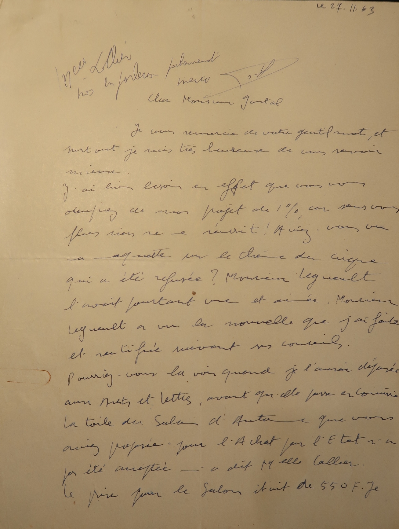 Recto de la lettre de l'artiste Claudine Henry à Pierre Goutal, inspecteur général des Arts graphiques et plastiques, le 27/11/1963, entre deux réunions de la commission nationale du 1%. NB : il est question dans la lettre de M. Legueult. Il s'agit probablement de Raymond Legueult (1898 -1971), chef d'atelier peinture à l'École nationale supérieure des beaux-arts, de 1952 à 1968.Immatriculation