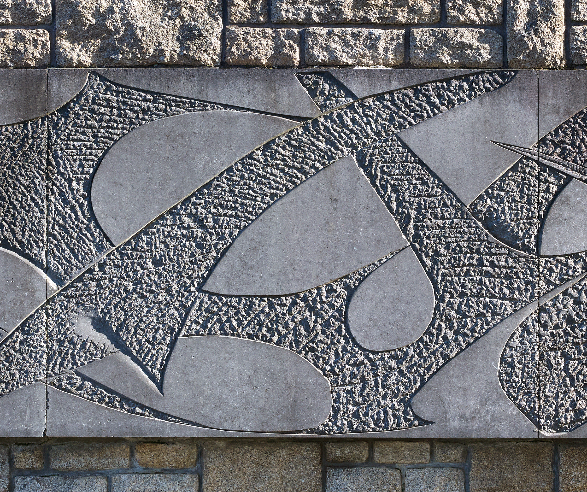 "L'envol", bas-relief en "petit granit belge" du sculpteur Yves Bonnard (1963-1964) : détail sur la partie centrale.Immatriculation