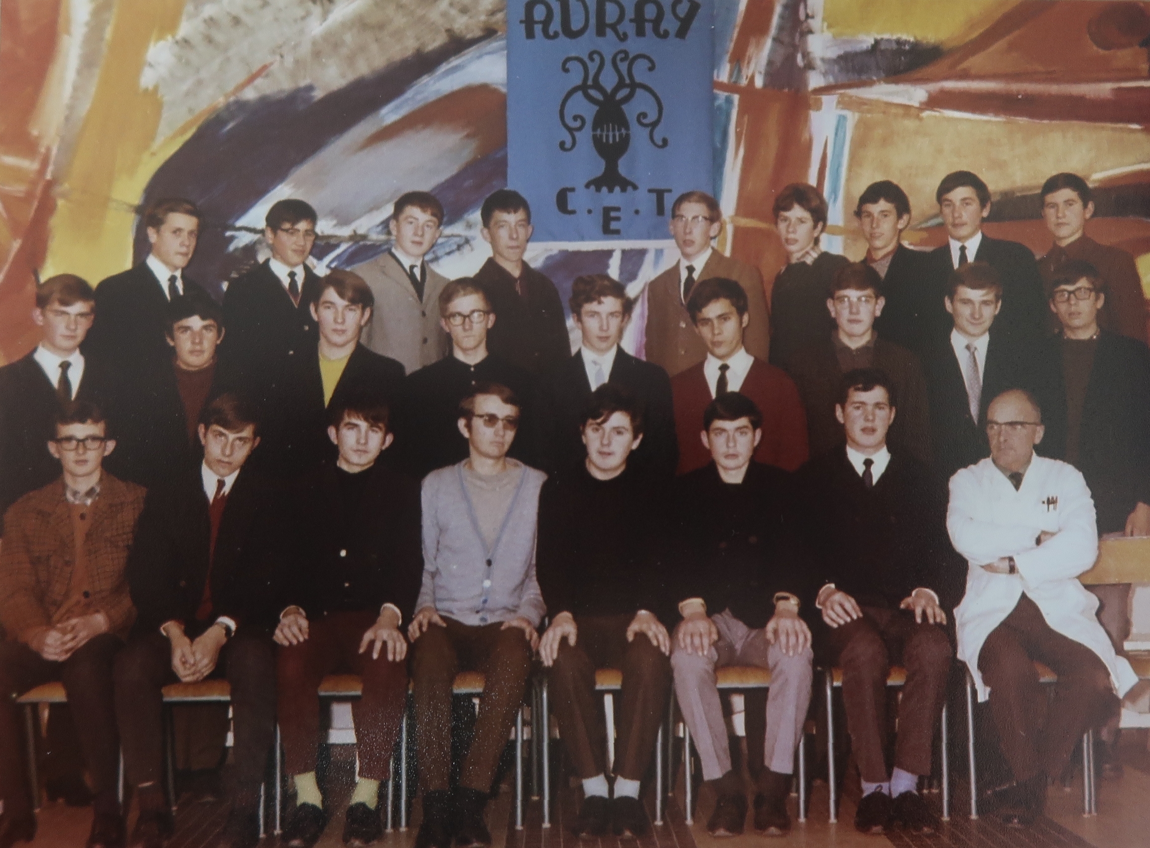 Fonds privé Robert Jacob : Photo de classe, devant une peinture murale, années 1960-1970.